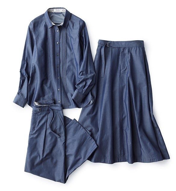 上品な光沢感が大人のカジュアルを格上げしてくれるダンガリーセットアップ。シャツは中心にピンタックを入れた、汎用性の高いデザイン。パンツは程よいボリュームのクロップド丈です。シャツとパンツの一部にリバティの「Juniper」を使用。さりげなくプリントが覗く仕立てに。スカートはウエスト部分のタブベルト仕様がポイントのフレアシルエットです。
