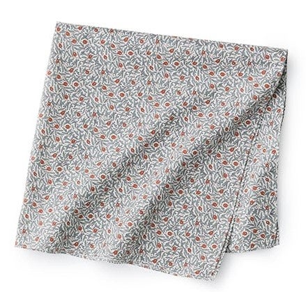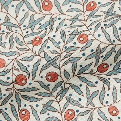1979年に作成されたリバティ社の「Juniper」は、ゆるやかなカーブラインで表現されたボタニカル柄が優しい雰囲気。NEWYORKER別注カラーでは、実と葉のナチュラルな色彩のコントラストが秋らしさを演出するデザインです。