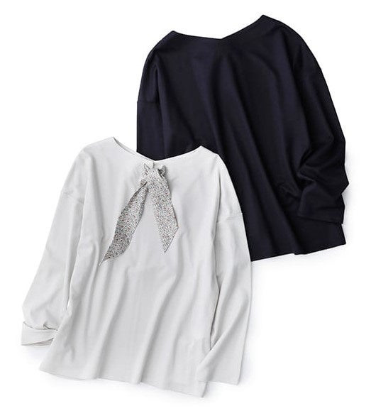 前後2WAYで着られる7分袖カットソー。リバティリボンは、お手持ちのスカーフに変えてアレンジも楽しめます。胸元はスナップ釦で止められるため、ボートネックインナーとしても着用可能。