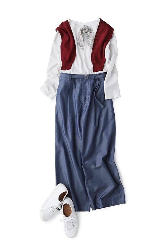 ホワイト×デニムに、ボルドーのカーディガンをオン。こっくりカラーを取り入れることで夏から秋へとシフトチェンジすることができます。軽さと季節感がマッチした端境コーデの完成です。
