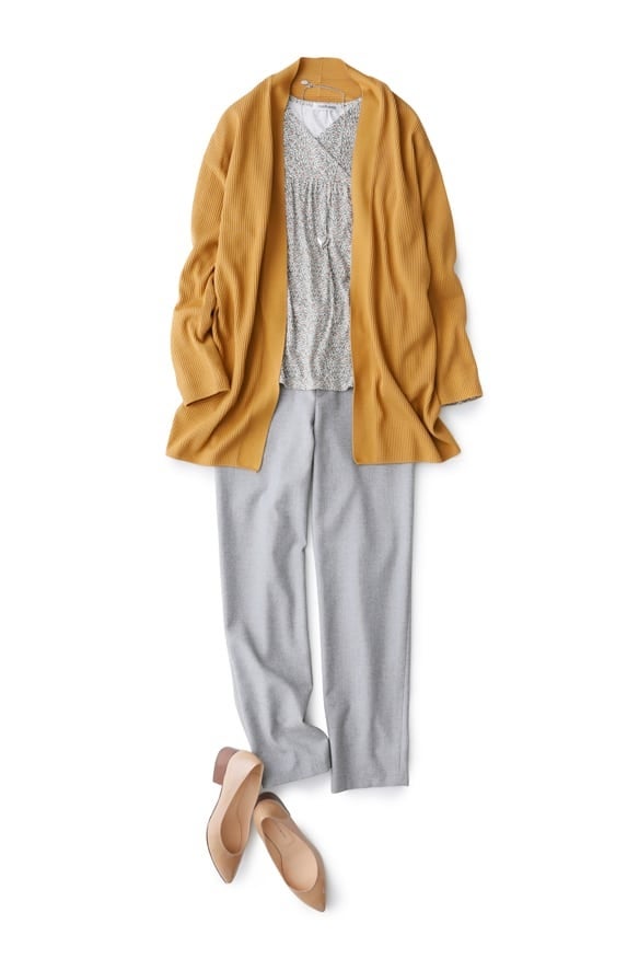 ギャザーカットソーには細身のパンツを合わせて、メリハリのあるシルエットに。マスタードカラーの着流しカーデでIラインを強調すれば、スッキリ見えと秋っぽさ両方が手に入ります。