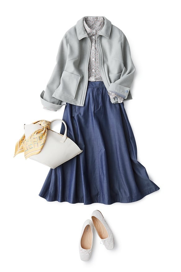 クリーンなブラウスには、軽快さを演出してくれるフレアスカートがおすすめです。季節の変わり目に欠かせないライトアウターも、グレイッシュなライトグリーンで品の良さを引き立てて。