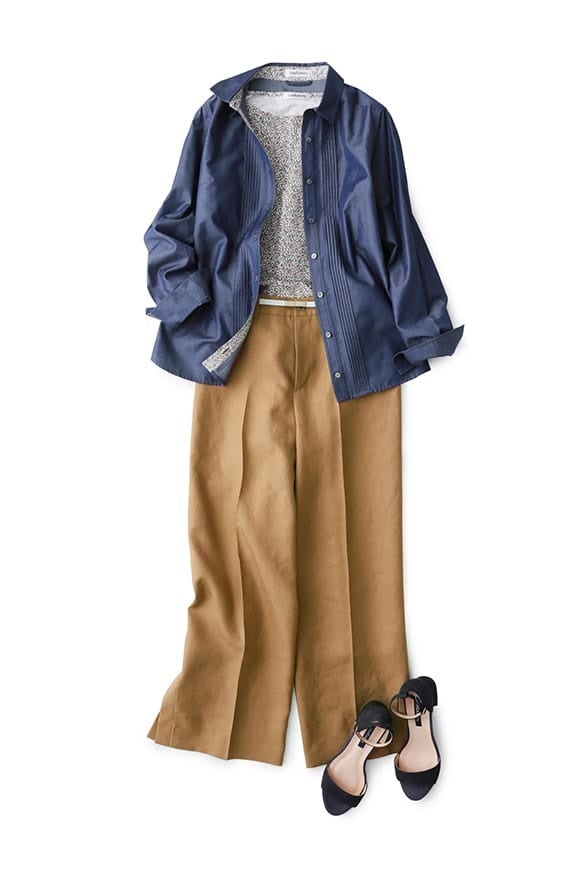 ダンガリーシャツとリンクした、「Juniper」のプリントカットソーを合わせて存在感をアピール。ちょっとしたディテールのこだわりが、大人のカジュアルスタイルに差をつけます。