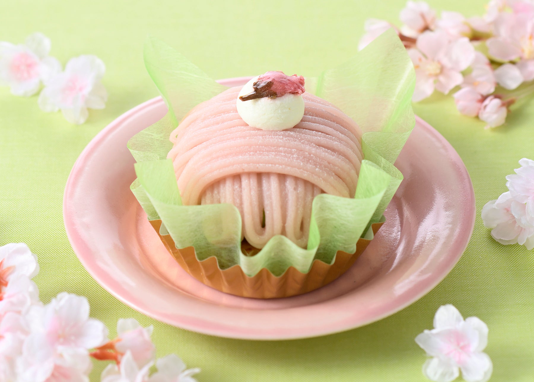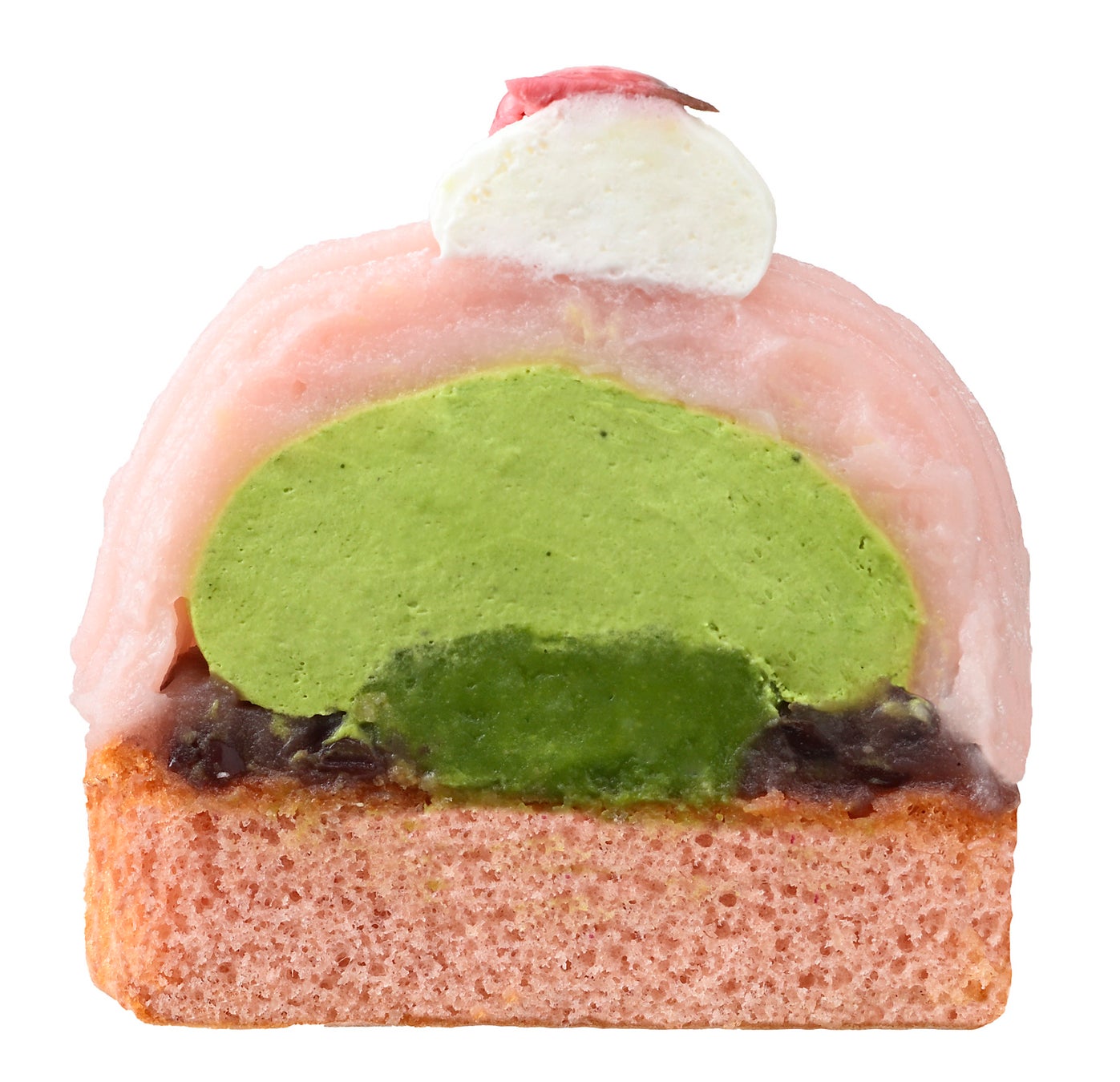 特長:桜風味のマドレーヌに粒あんとほどよい苦みの抹茶あんを重ね、たっぷりの抹茶クリームと桜あんで包み込みました。ちょこんと載せた桜花の塩漬けが味わいのアクセントになっています。桜と抹茶の味わい・香り・色合いが春を感じさせるモンブランです。