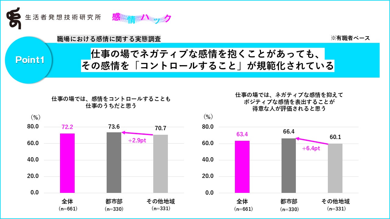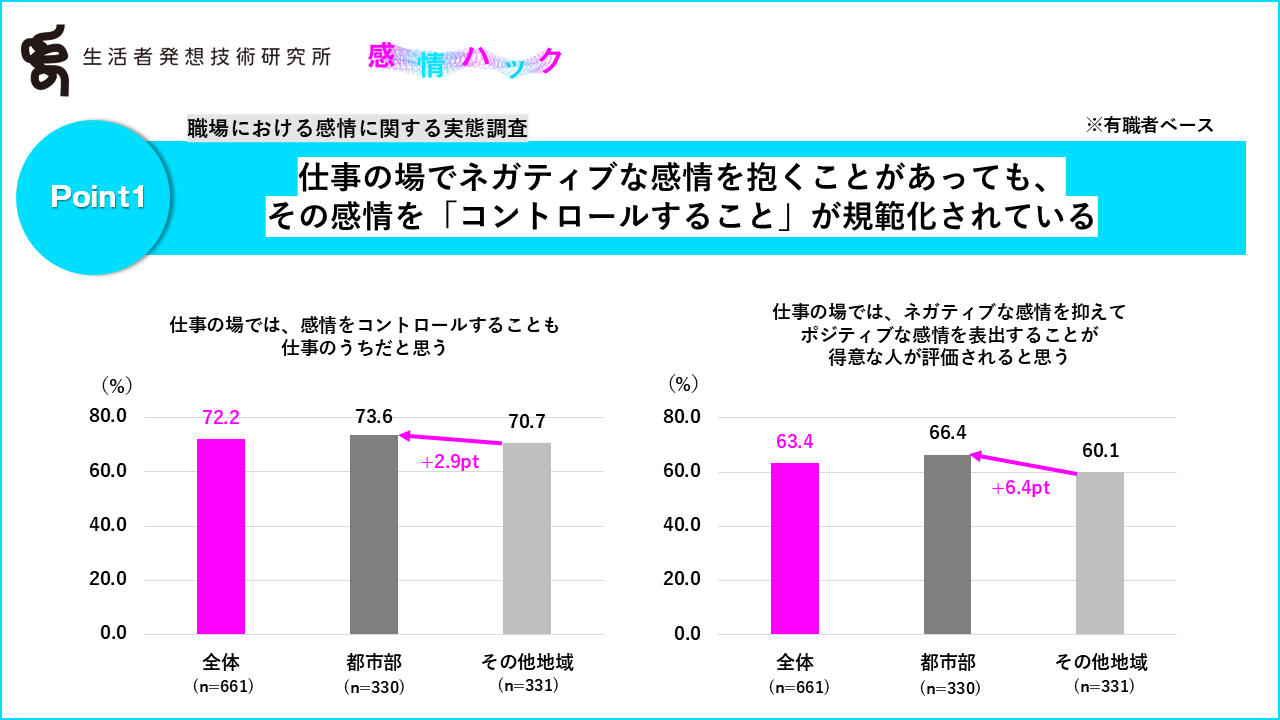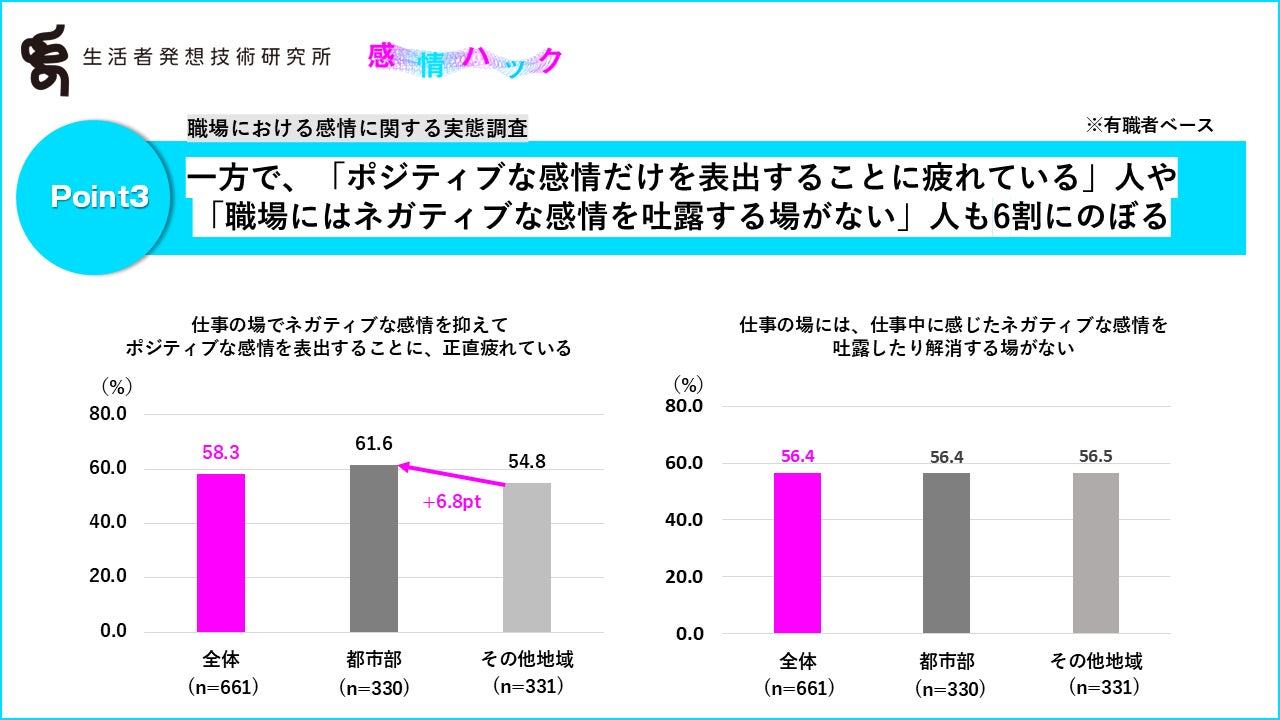 一方で、「仕事の場でネガティブな感情を抑えてポジティブな感情を表出することに、正直疲れている」も有職者全体で58.3%と過半数となり、特に都市部で高い結果となりました(都市部:+6.8pt)。