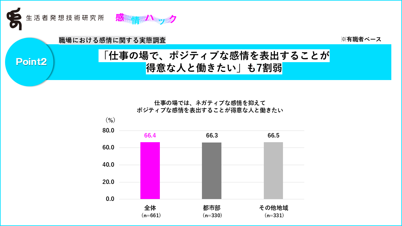 また、有職者のうち「仕事の場で、ポジティブな感情を表出することが得意な人と働きたい」人は都市部・その他地域ともに66%となりました。「ポジティブに振舞うほうが評価される」という職場からの要請を感じているだけでなく、生活者の側もポジティブに振舞える人と働きたいと思っていることがわかる結果です。