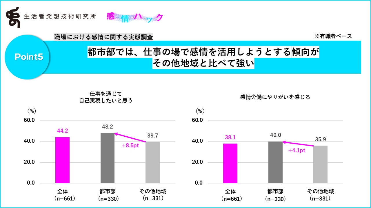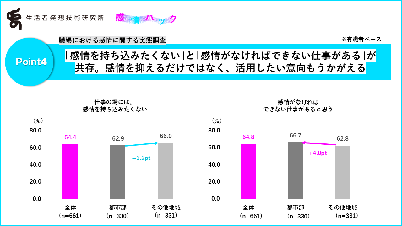 なお、「仕事の場には感情を持ち込みたくない」はその他地域のほうが高く(その他地域:+3.2pt)、「感情がなければできない仕事がある」は都市部のほうが高くなっており(都市部:+4.0pt)、感情を仕事に活用したいかどうかといった意識にはやや地域差があるようです。
