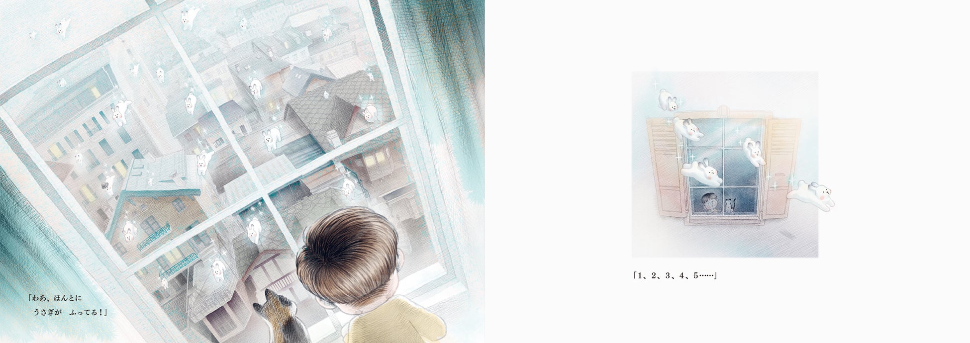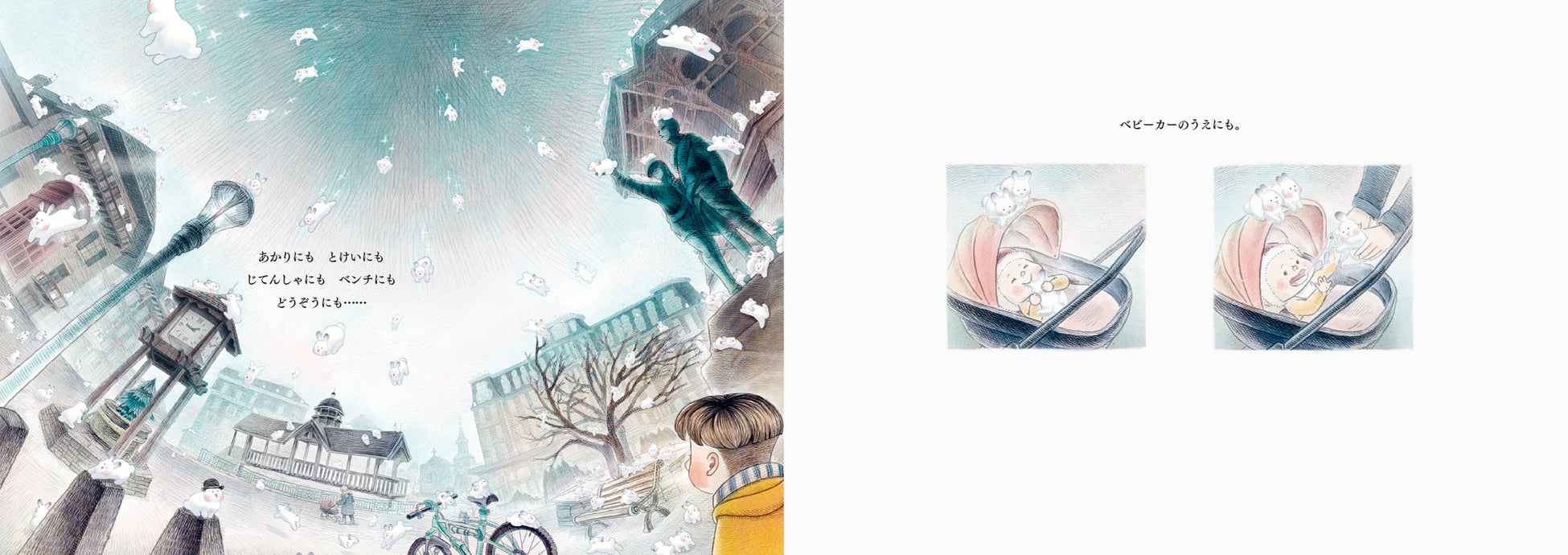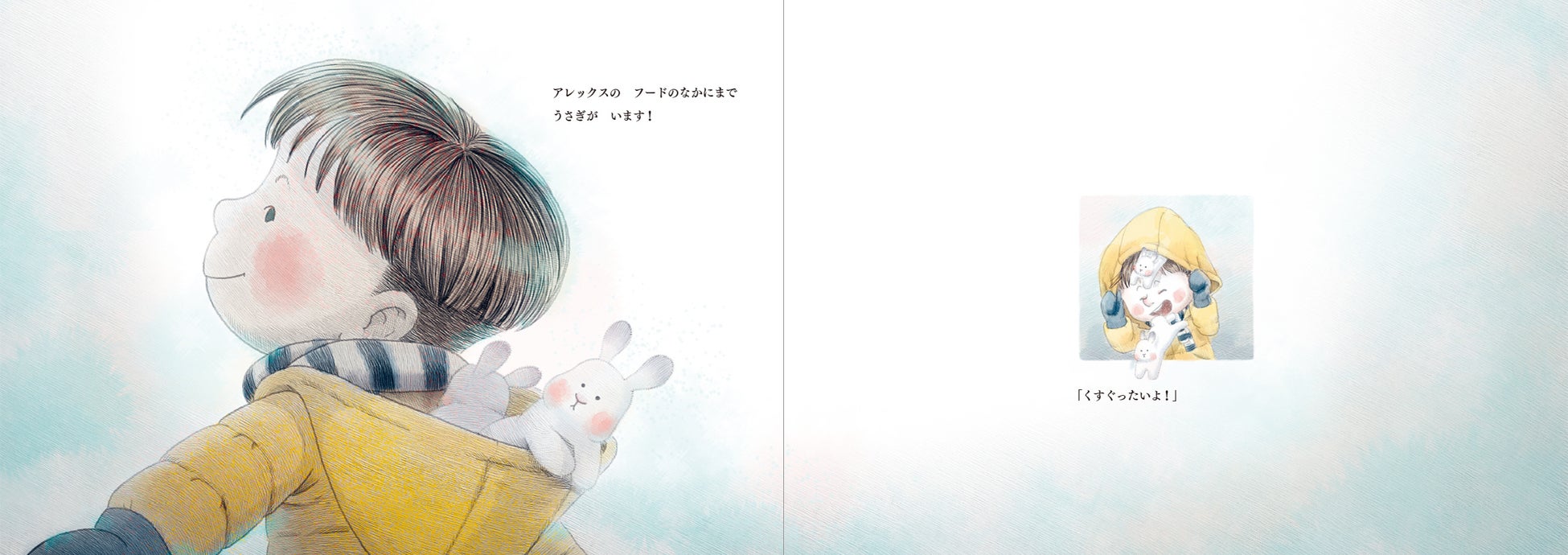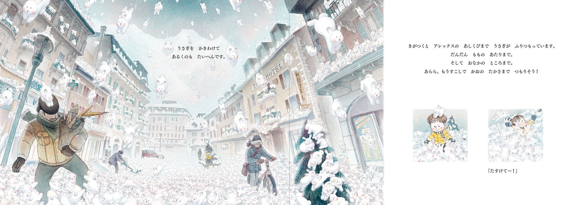 寒い朝、窓の外を見てアレックスは驚きました。空から雪のように、たくさんのうさぎが降っているのです。外へ出ると、木の上、車の上、屋根、ベンチ、そこかしこにうさぎがいます。冬の日の不思議でわくわくするようなできごとを美しく描いた絵本。