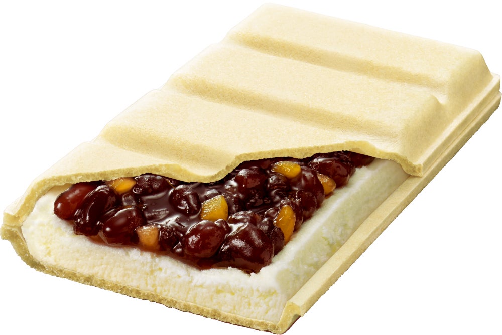 ① 北海道産あずき使用の栗粒入り餡と自然な甘さのバニラアイスをサンドした和風モナカです。