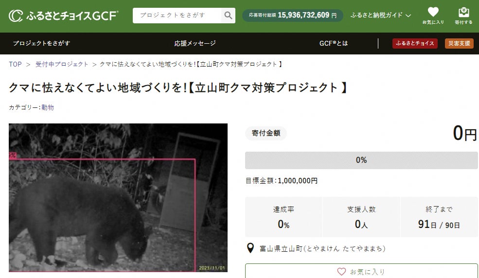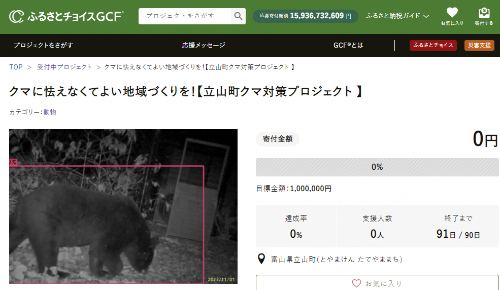 富山県立山町とふるさとチョイス、ふるさと納税制度を活用したガバメントクラウドファンディング®で、クマによる人身被害防止を目的としたプロジェクトを開始