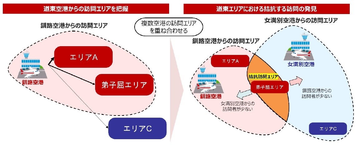 さらに、どのエリアがどの空港を利用するかの関係性も明らかになり、複数空港の航空利用者割合が拮抗するエリアも浮かび上がってきました。道東エリアでは、釧路空港と女満別空港の訪問エリアは、摩周湖などが位置する弟子屈エリア周辺で拮抗し、そこが「釧路空港圏」と「女満別空港圏」の「拮抗訪問エリア」となることが分かりました。