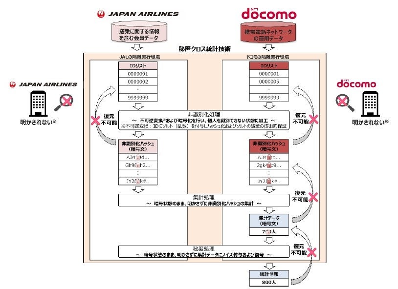 秘匿クロス統計技術(以下、 本技術)」は、相互にデータを明かさない状態で安全な統計情報を作成することを可能にする、NTTグループが推進する次世代ICT基盤構想「IOWN®︎」の構成技術です。本実証実験では、本技術を用いて、JALとドコモが保有する同じ形式の ID リストを、それぞれの安全な処理環境(隔離実行環境)で非識別化処理(不可逆変換および暗号化)を行い、個人を識別できない状態に加工した上で、暗号状態のまま集計処理と秘匿処理を実施します。