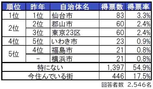 住みたい街は1位は2年連続で仙台市。2位は郡山市(2年連続)と東京23区。