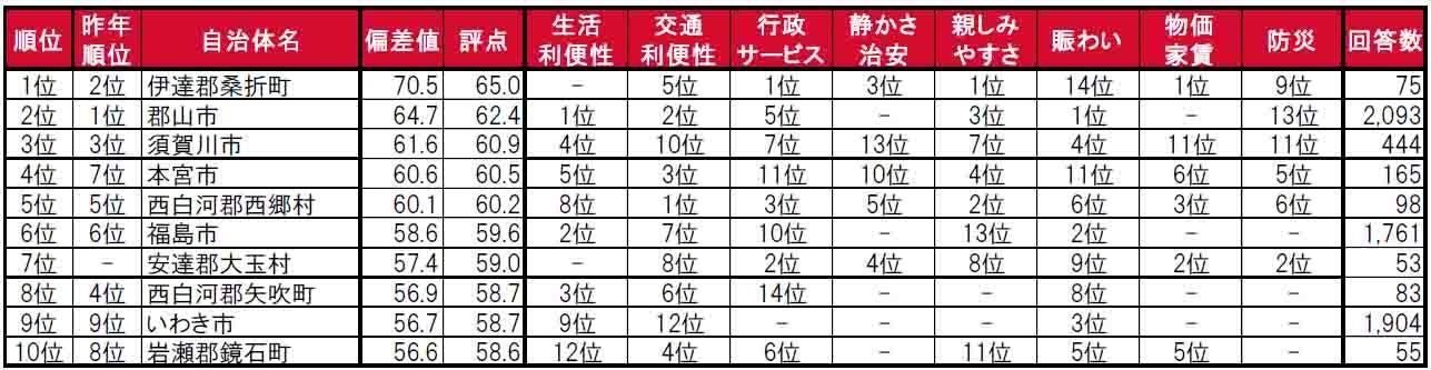 住みここちは、1位伊達郡桑折町、2位郡山市。3位は3年連続で須賀川市。
