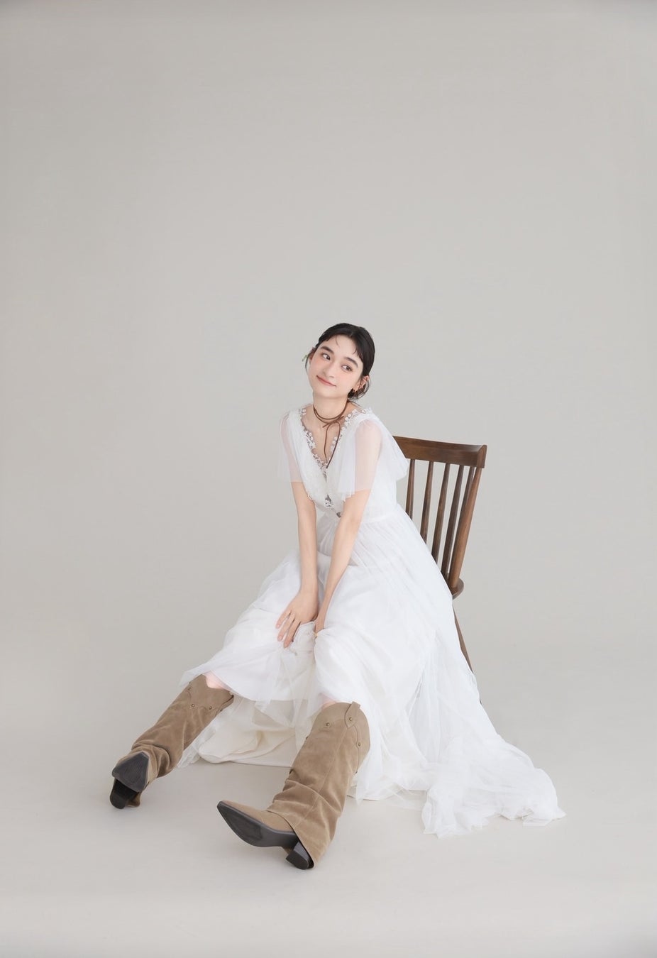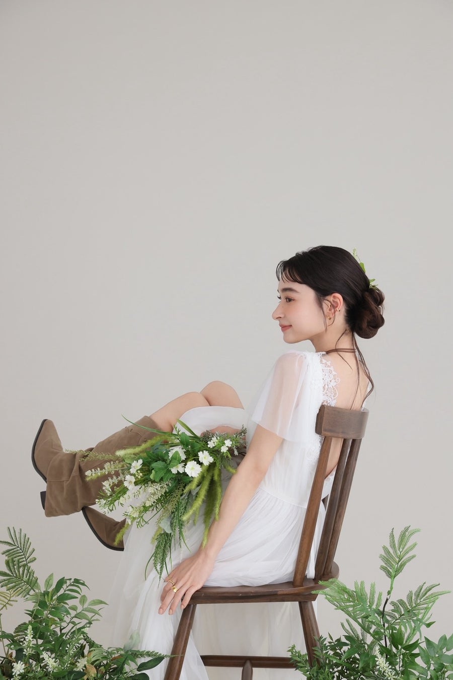 ヘアスタイルはゆるりと結んだアップスタイル。
