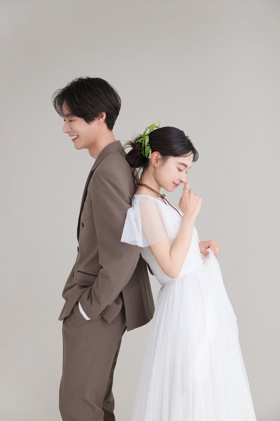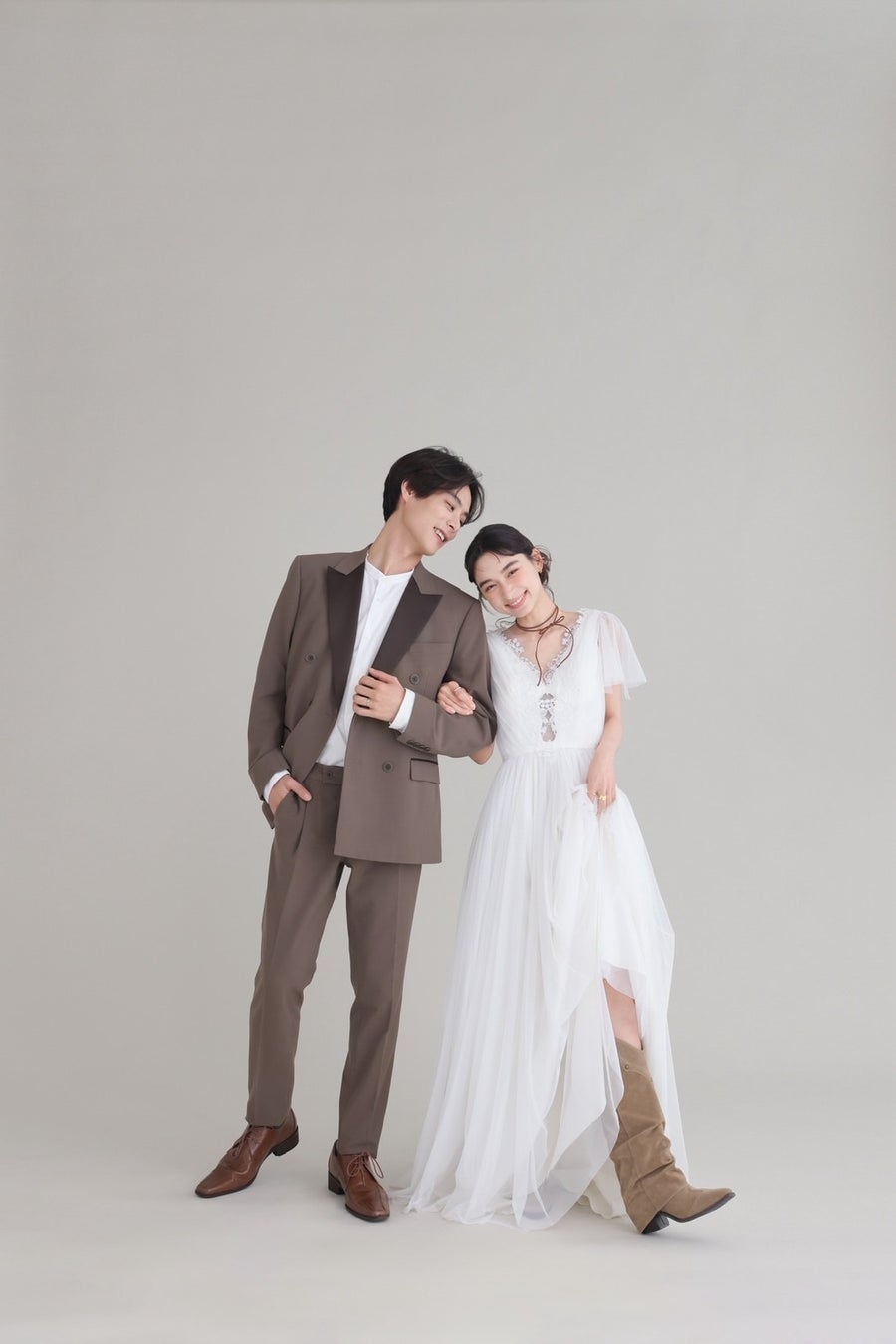 メンズのタキシードにはモカカラーをセレクトして2人のコーデに統一感を。
