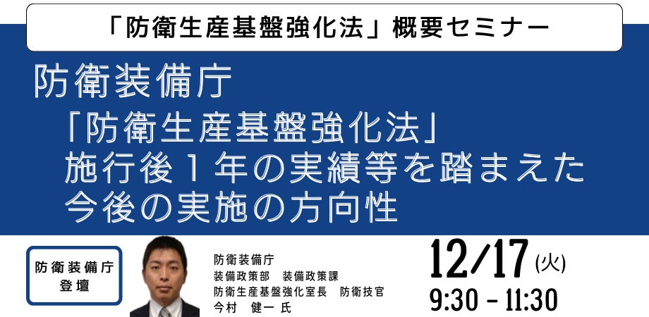 今回のセミナーでは、防衛生産基盤強化法に係る諸施策のご理解を深めていただくとともに、法律施行後1年間の実績等を踏まえた今後の実施の方向性について詳説します。