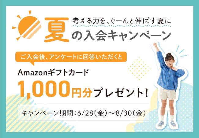 株式会社増進会ホールディングス(Z会グループ)のグループ会社である株式会社Z会は、「Z会の通信教育」小学生向けコースにおいて、「夏の入会キャンペーン」を実施中です。2024年8月30日(金)までにご入会いただき、アンケートにご回答いただいた方全員に、Amazonギフトカード1,000円分を差し上げます。