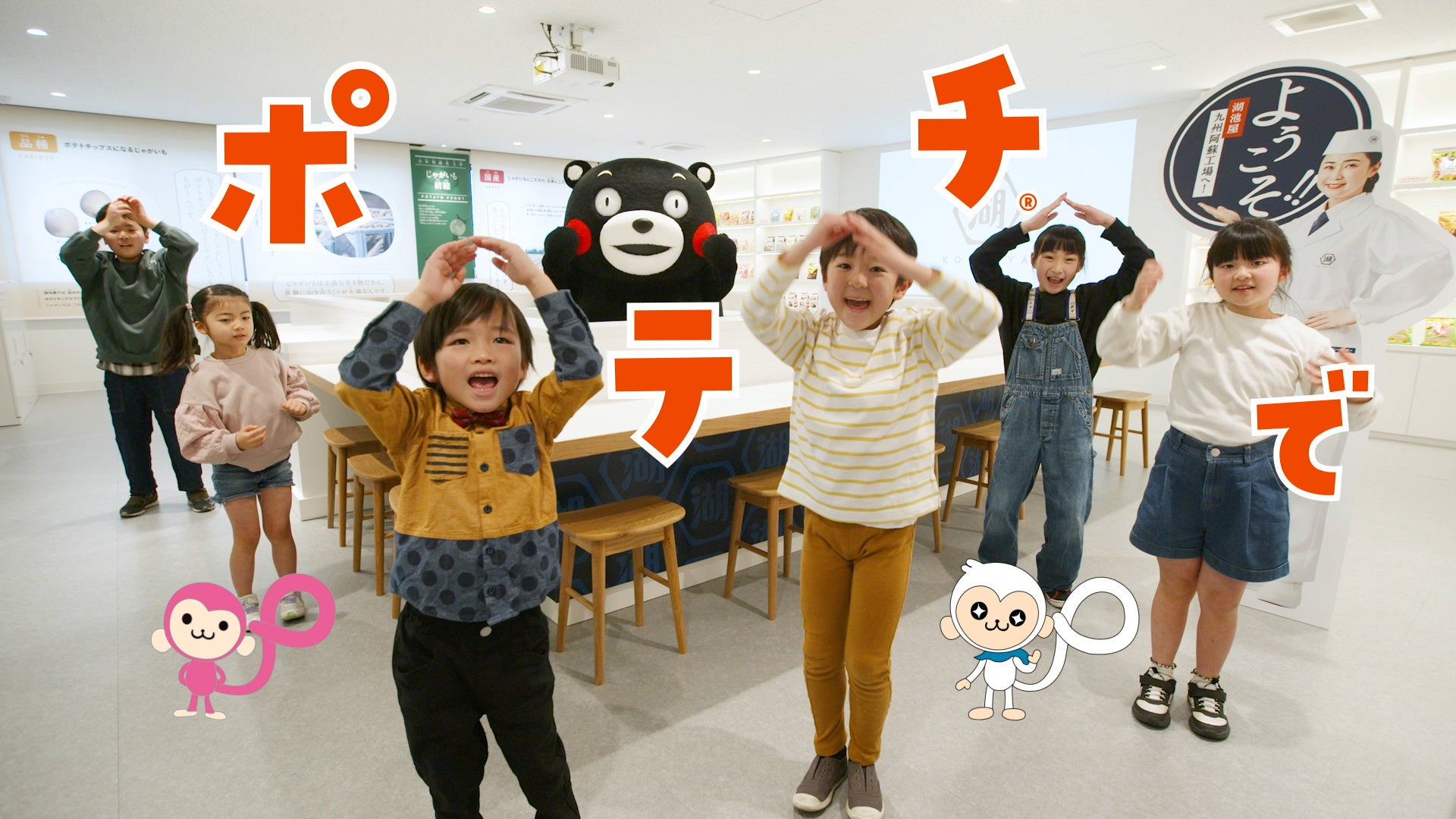 熊本の観光名所や湖池屋 九州阿蘇工場内にオープンしたマイポテチ®体験施設「湖池屋GOGO!ファクトリー」等を背景に、八代亜紀さんの歌う「ポテチ®でタンタカ」のリズムにあわせて、八代亜紀さん、熊本県営業部長兼幸せ部長“くまモン”、地元・益城町の子どもたちや九州阿蘇工場の社員たちが、楽しいダンスを踊ります。「カラムーチョ」のヒーおばあちゃんや「ポリンキー」のスリーポリンキーズなど、湖池屋商品のキャラクターたちも大集合!どこにどのキャラクターが登場しているかにもご注目ください。