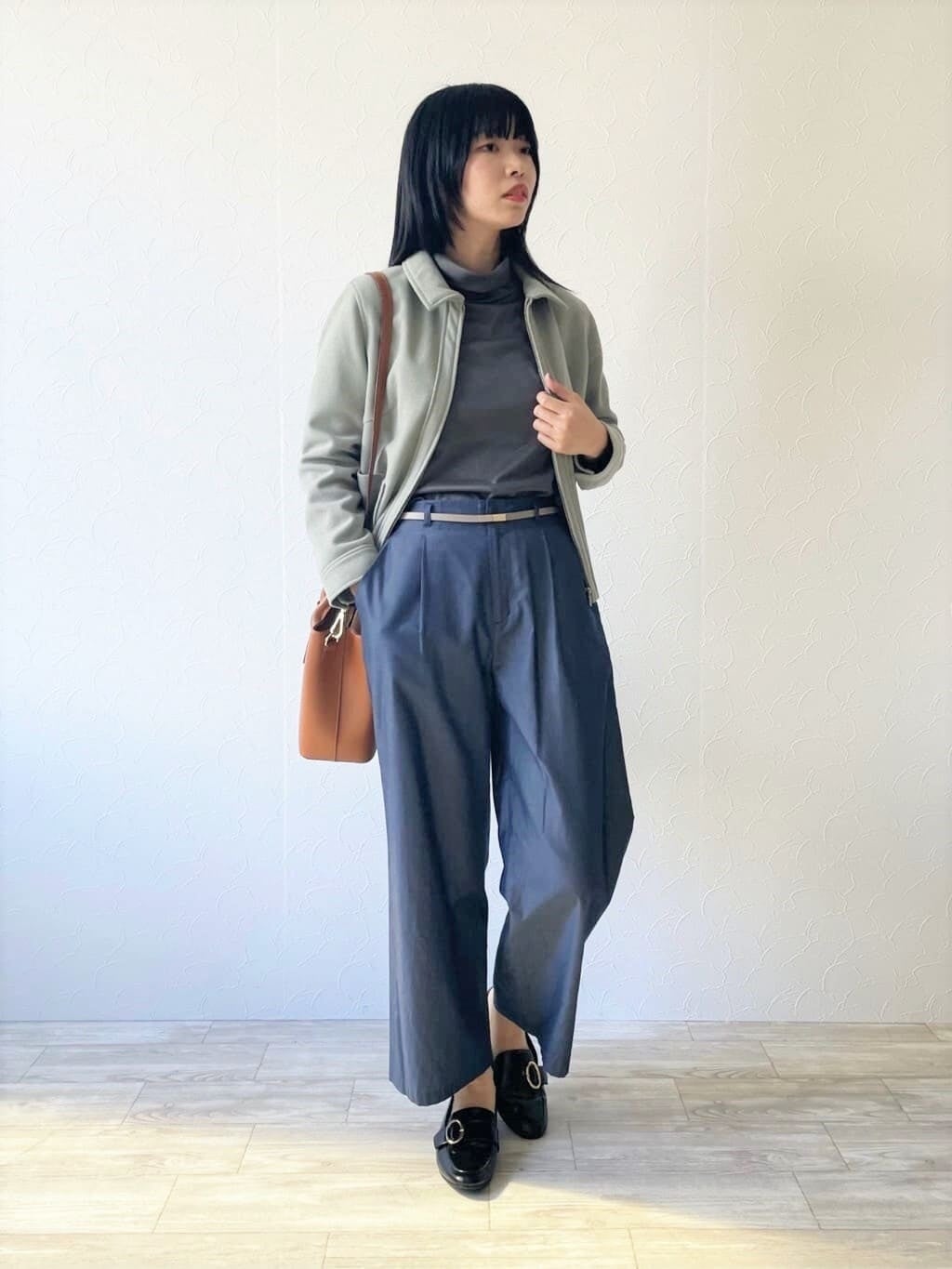 ブルゾンを合わせてマニッシュな雰囲気に。パンツの共布ベルトをレザーベルトに付け替えると、異なる表情が楽しめます。