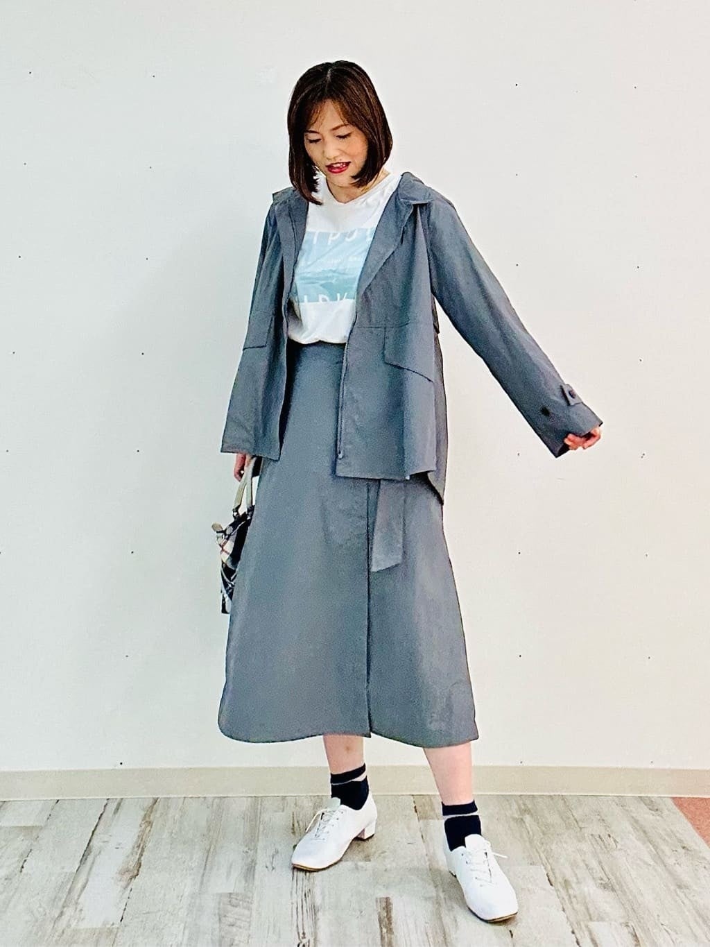 スカートと同素材のフードブルゾンをオン。上下共にゆったりとしたシルエットがリラクシーで、普段使いに最適です。