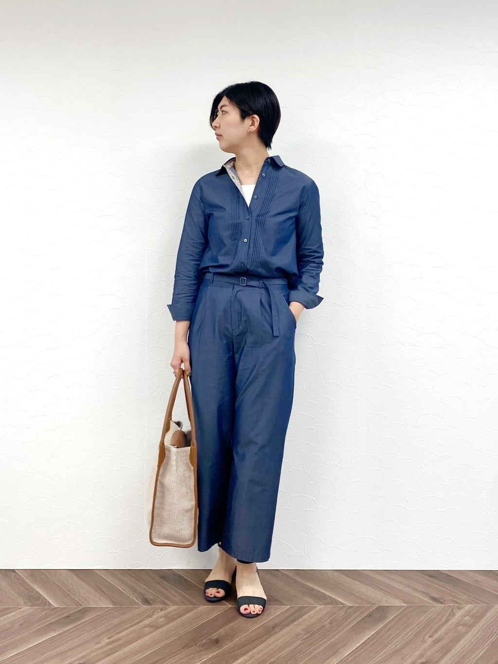 光沢感が上品なダンガリーのワイドパンツ。シンプルでコーディネートに取り入れやすく、暑い季節からロングシーズン活躍するアイテムです。