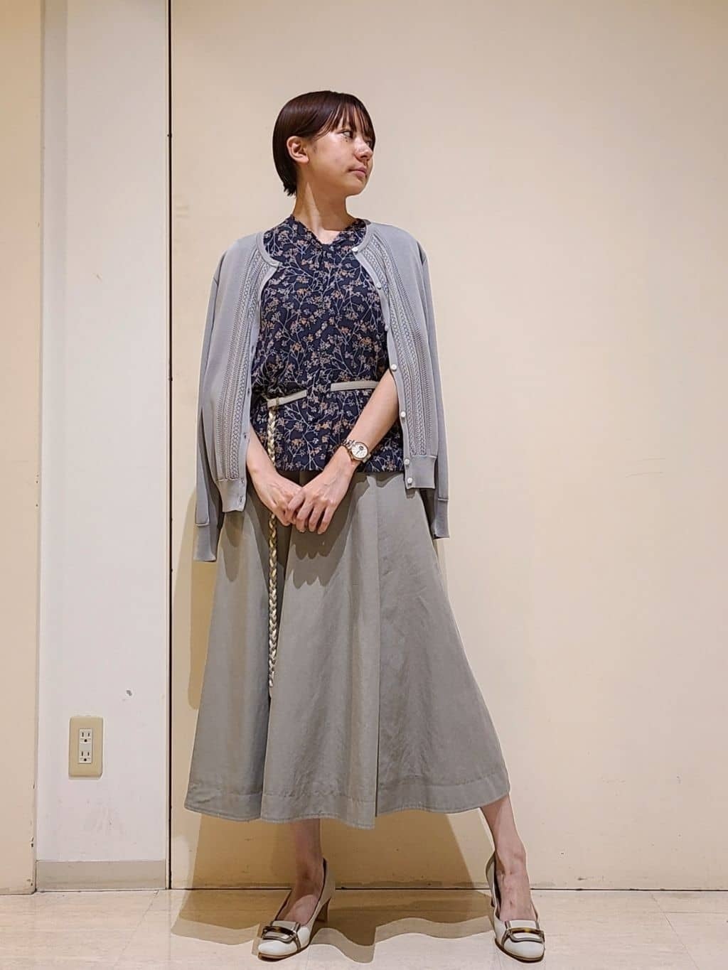 くすみカラーを効かせて秋を先取り。透かし編みのカーディガンや麻混素材のスカートは、暑さの残る時期でも着心地快適です。