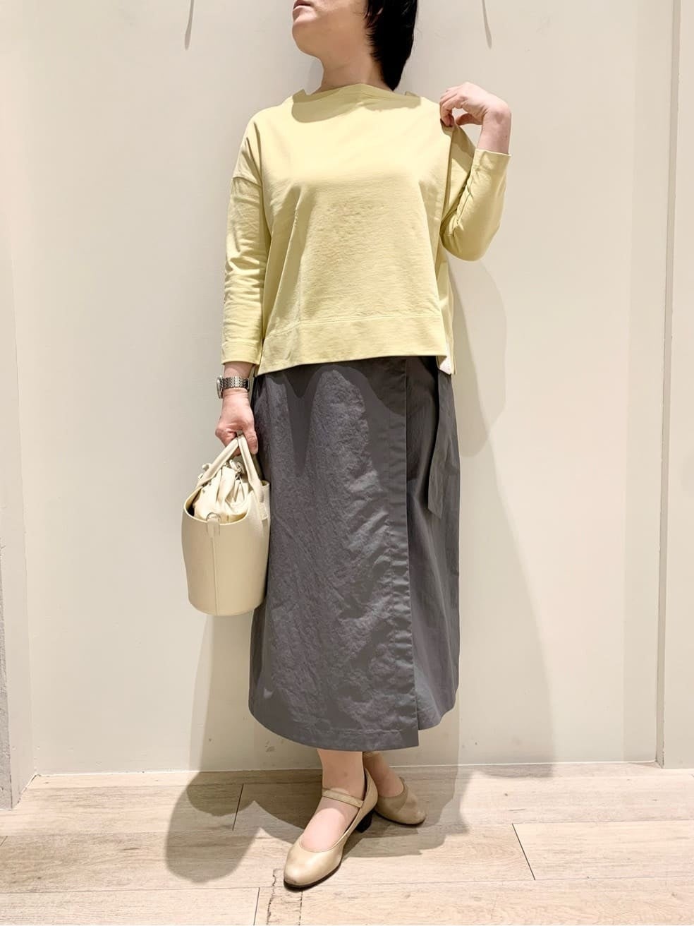 優しいクリーム色のカットソーを合わせてシンプルに。ボートネックや手首の覗く8分袖が、軽やかな印象を与えてくれます。