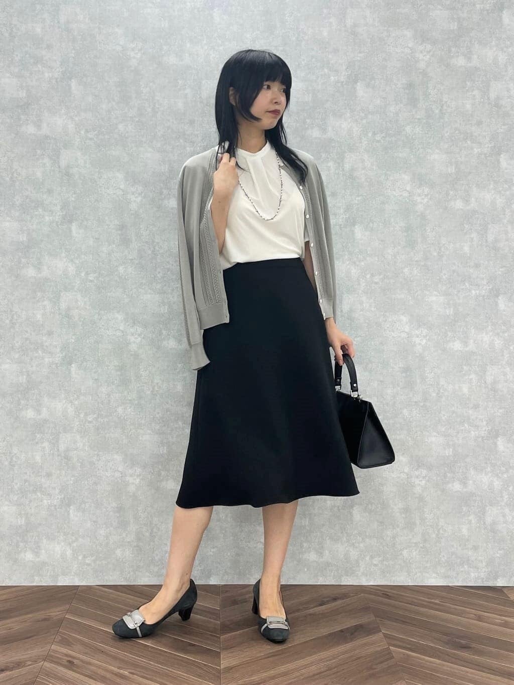 季節の変わり目におすすめのモノトーンスタイル。ドライタッチなニットカーディガンは、寒暖差の大きい日の体温調節に◎