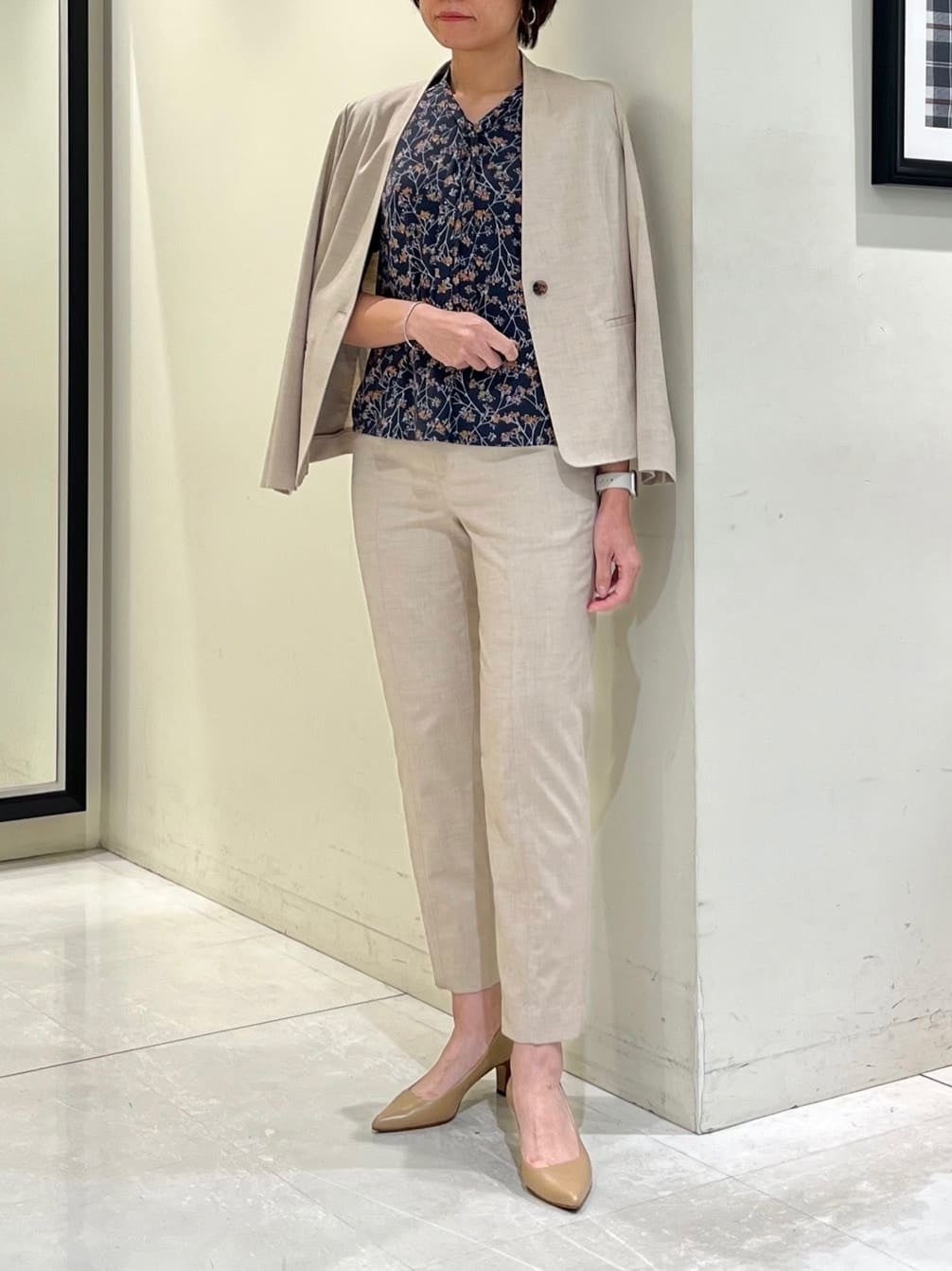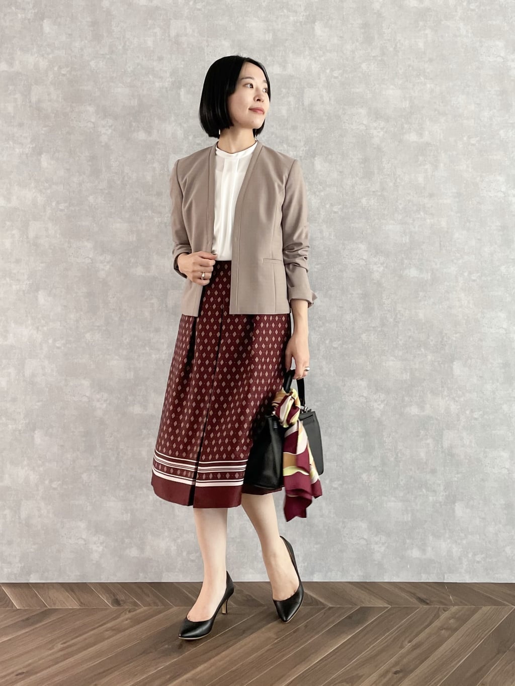 セットアップと合わせれば、秋の通勤スタイルに。カットソーのプリントとボウタイが程よい華やかさを添えてくれます。