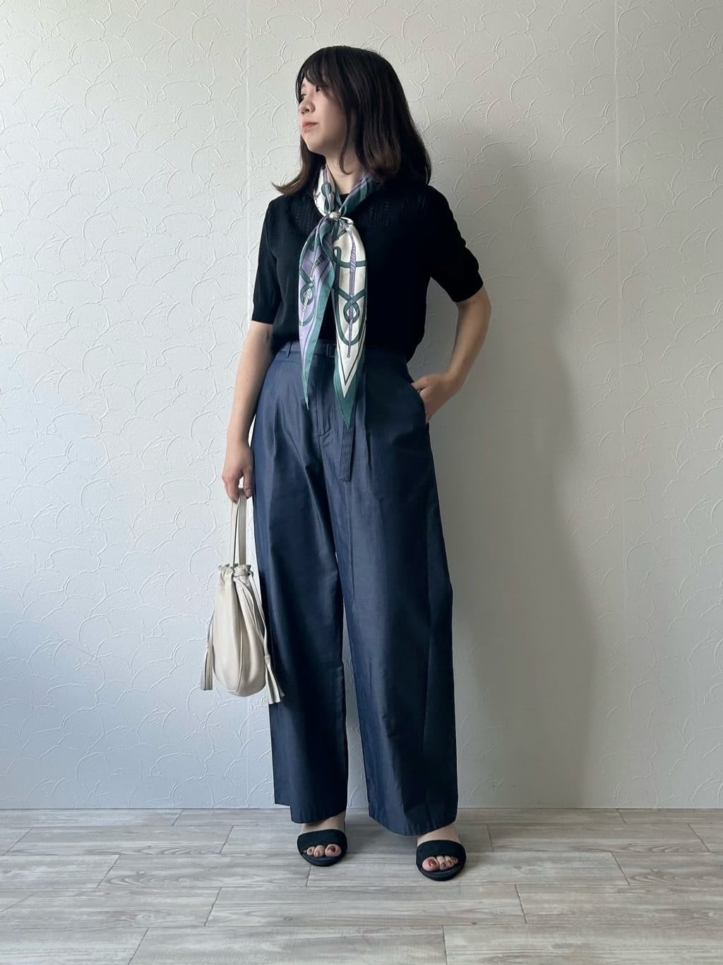 半袖ニットを合わせたサマーブラックスタイル。スカーフをプラスすれば、カジュアルな中にも上品さのある着こなしに。