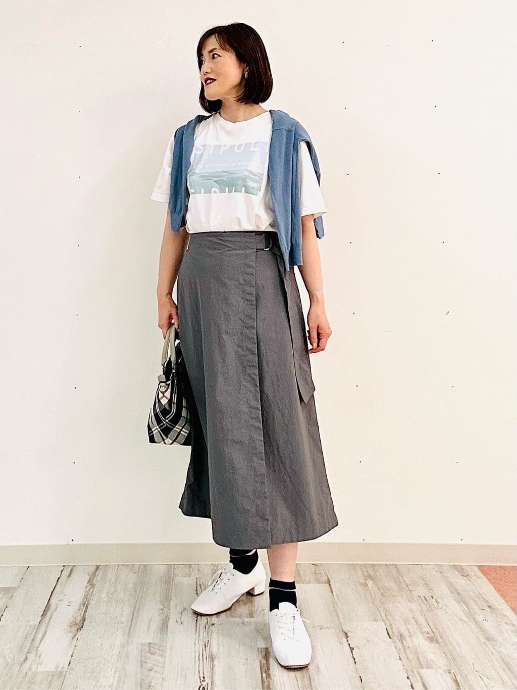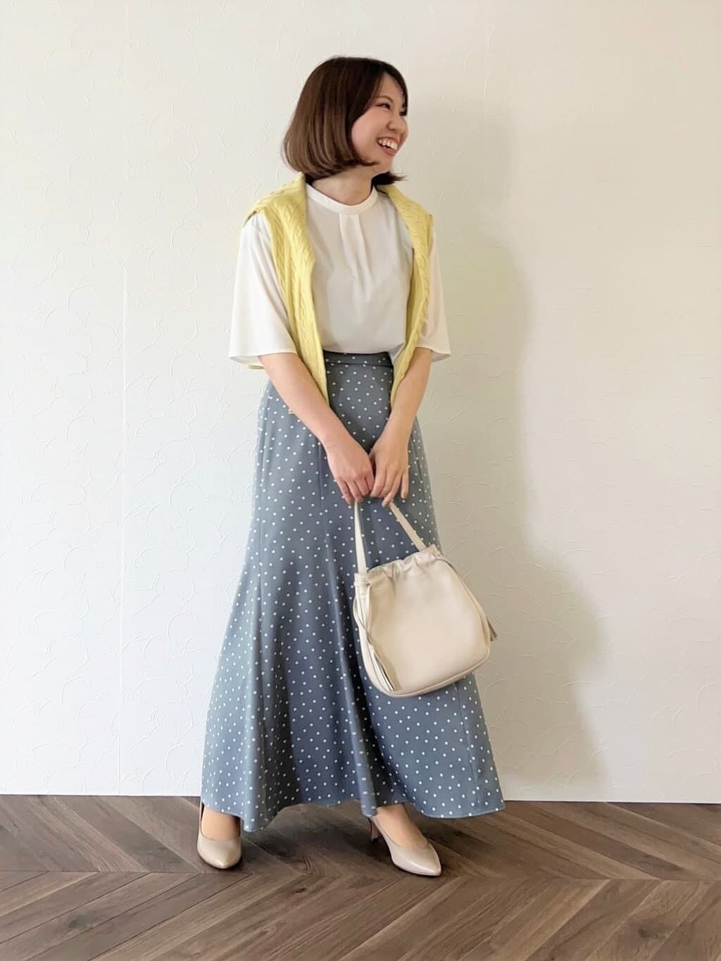ドット柄のスカートでカジュアルダウン。ホワイトやサックス、イエローを使った明るい色合わせが清涼感を高めてくれます。