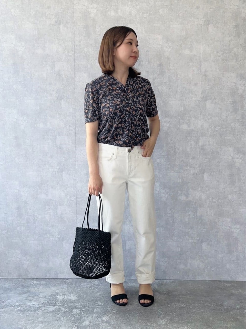 ホワイトデニムで爽やかさを演出。メッシュ素材のバッグやサンダルなど、小物にも夏らしさを取り入れました。