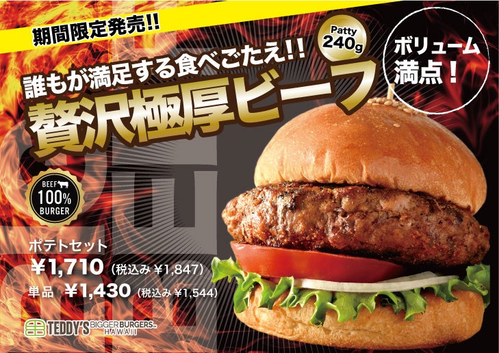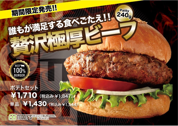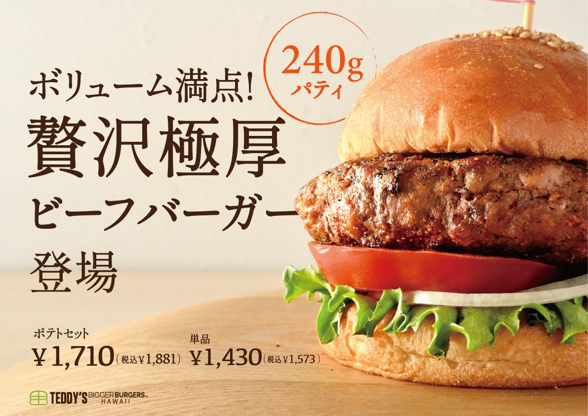 ハワイ発の人気グルメバーガーより、なんと“ 240g“のBEEF100%パティを使用した、ボリューム満点!「贅沢極厚ビーフバーガー」期間限定で新登場!「テディーズビガーバーガー」