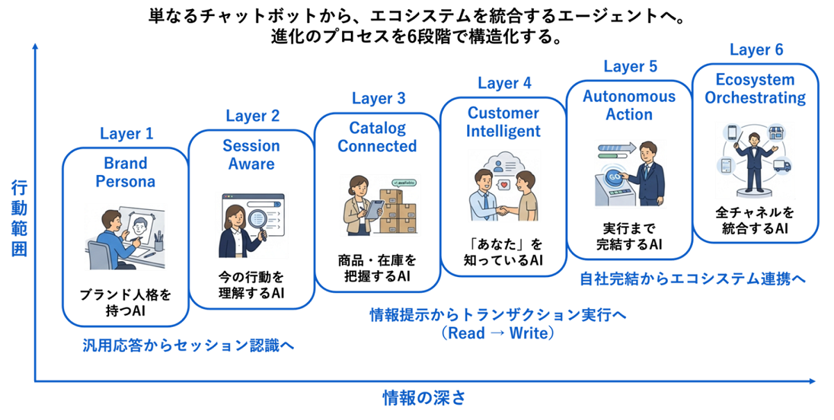 このモデルを起点に、企業が「今どのレイヤーにいるか」「次にどこを目指すか」を明確にした上で、目標レイヤーへの到達に向けた構築・運用を段階的に支援します。ブランドの人格設計(Layer 1)から始め、在庫・顧客データとの連携(Layer 3〜4)、購買の自律実行(Layer 5)、全チャネル統合(Layer 6)へと、企業の状況に応じたペースで進化させていきます。