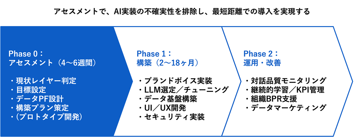 本サービスは、まず4〜6週間のアセスメントフェーズ(Phase 0)でブランドCX起点でのAIエージェントの目標像を定義し、実現に向けた段階的な構築プランと費用対効果を策定します。その後、同プランに基づき、AIエージェントの設計・開発から、品質モニタリング・継続学習・KPI管理・対話データを活用した顧客インサイトの発掘まで、プロジェクト全体を一貫して伴走します。