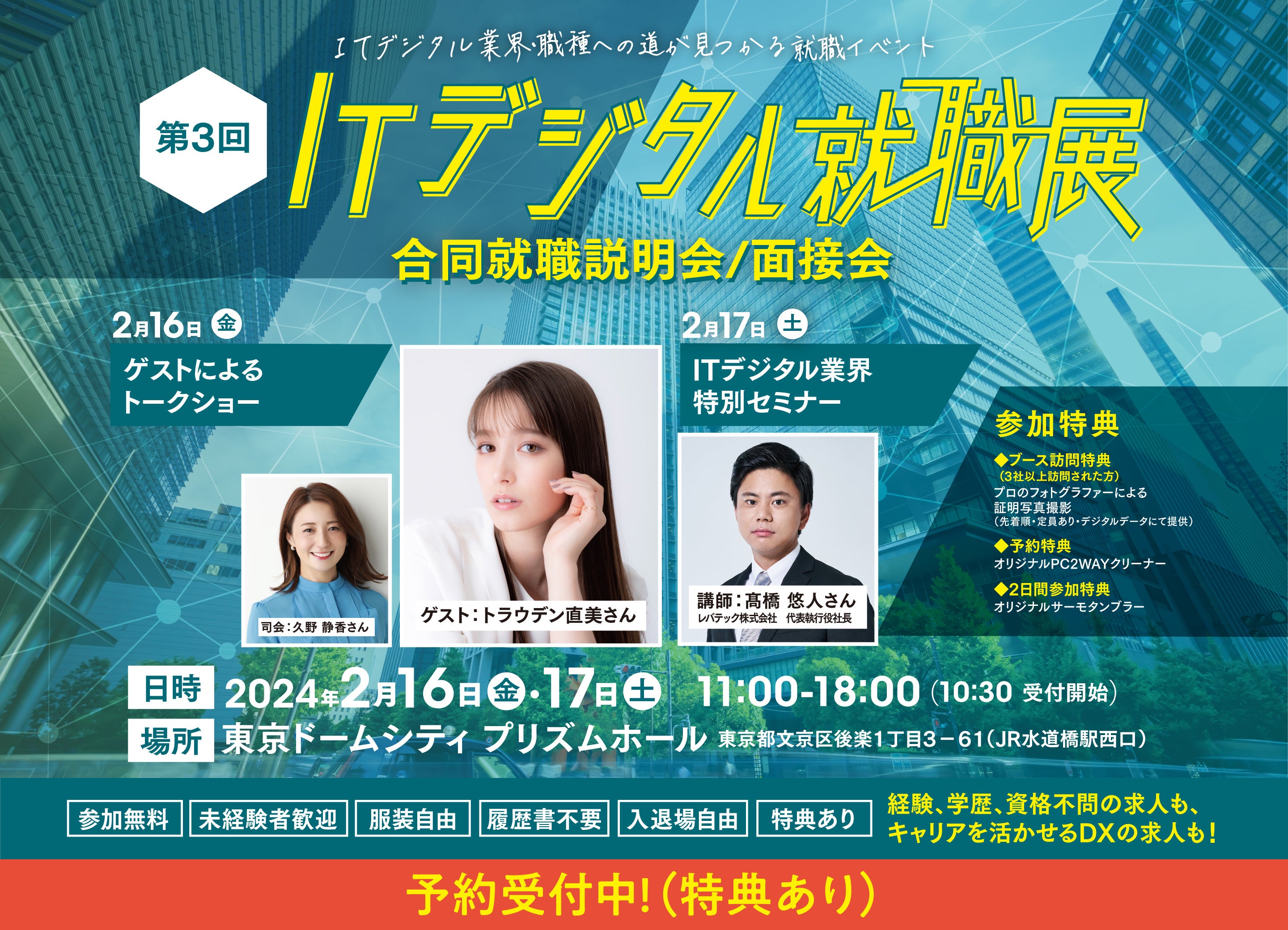 世界中で「DX」が進む中、日本でもデジタルの知識、ITのスキルを持った人材ニーズが高まっています。そこで、デジタル関連の仕事(IT・情報通信業界や、IT関連の職種など)に関心のある方や就職・転職を希望する方のために、TOKYOデジタルキャリアフェア「ITデジタル就職展」を開催します。