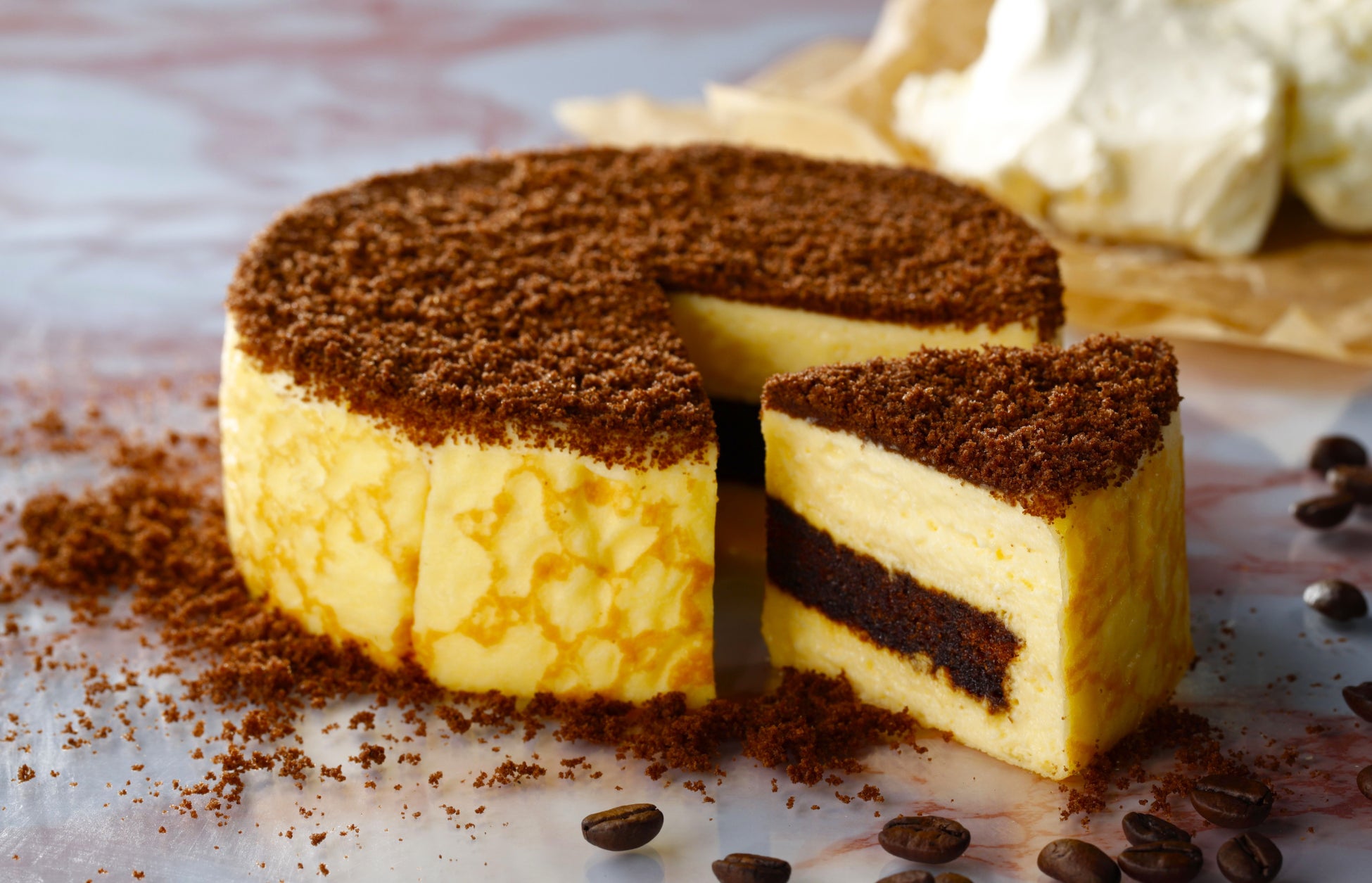 コーヒーシロップを染み込ませたココアスポンジ生地に、北海道産マスカルポーネとフランス産クリームチーズを使用したティラミスクリームを重ね合わせ、 コーヒーパウダーと一緒にココアスポンジクラムをトッピングした、口どけのよい期間限定のケーキです。