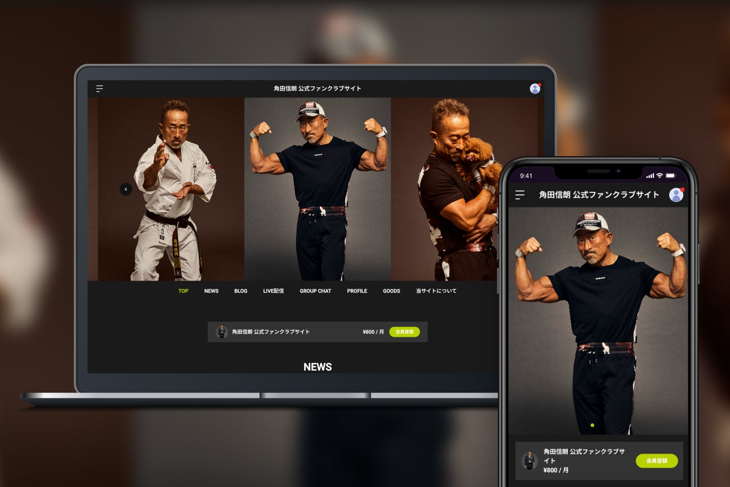 この度オープンしたのは、角田信朗のファンクラブサイトです。当サイトの有料会員に登録いただくと、会員限定のグループチャットや、ブログ、ライブ配信など、スペシャルな特典をお楽しみいただけます。