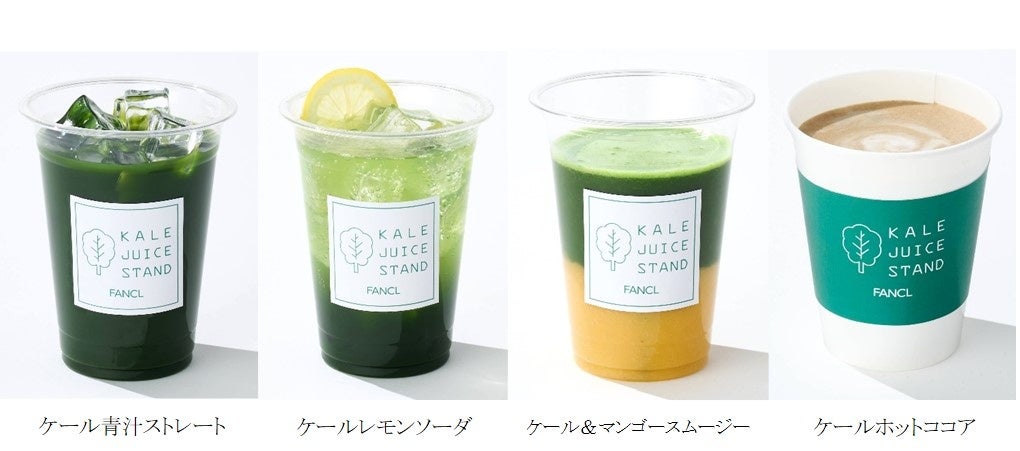 ケール100%の「搾りたてケール青汁」(冷凍)を使用した、オリジナルジュースなどを展開します。2月9日(金)からは4種類のメニューを展開し、5種のサプリメント(ディープチャージ コラーゲンパウダー、カロリミット茶、食物繊維、毎日大豆たんぱく、歩くサプリ)の中から、トッピングを選ぶことができます。