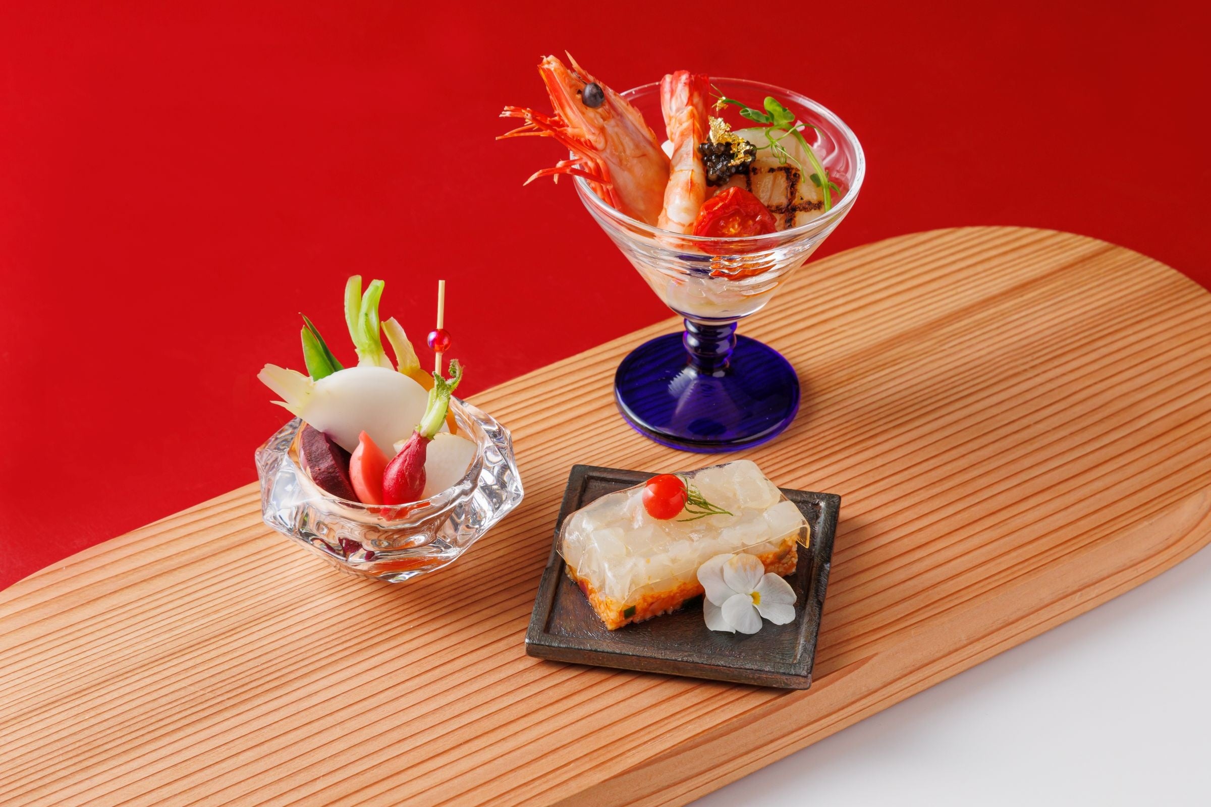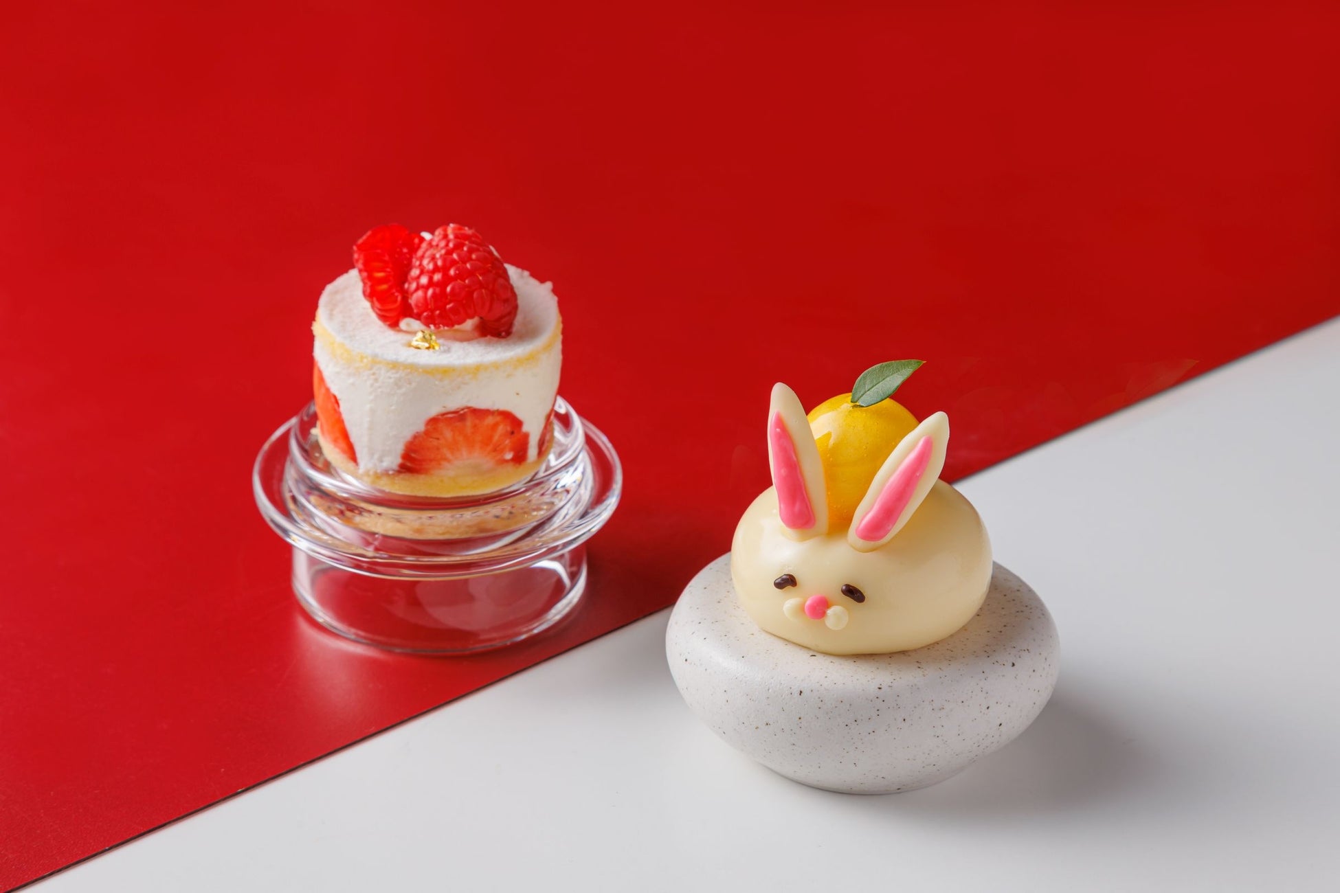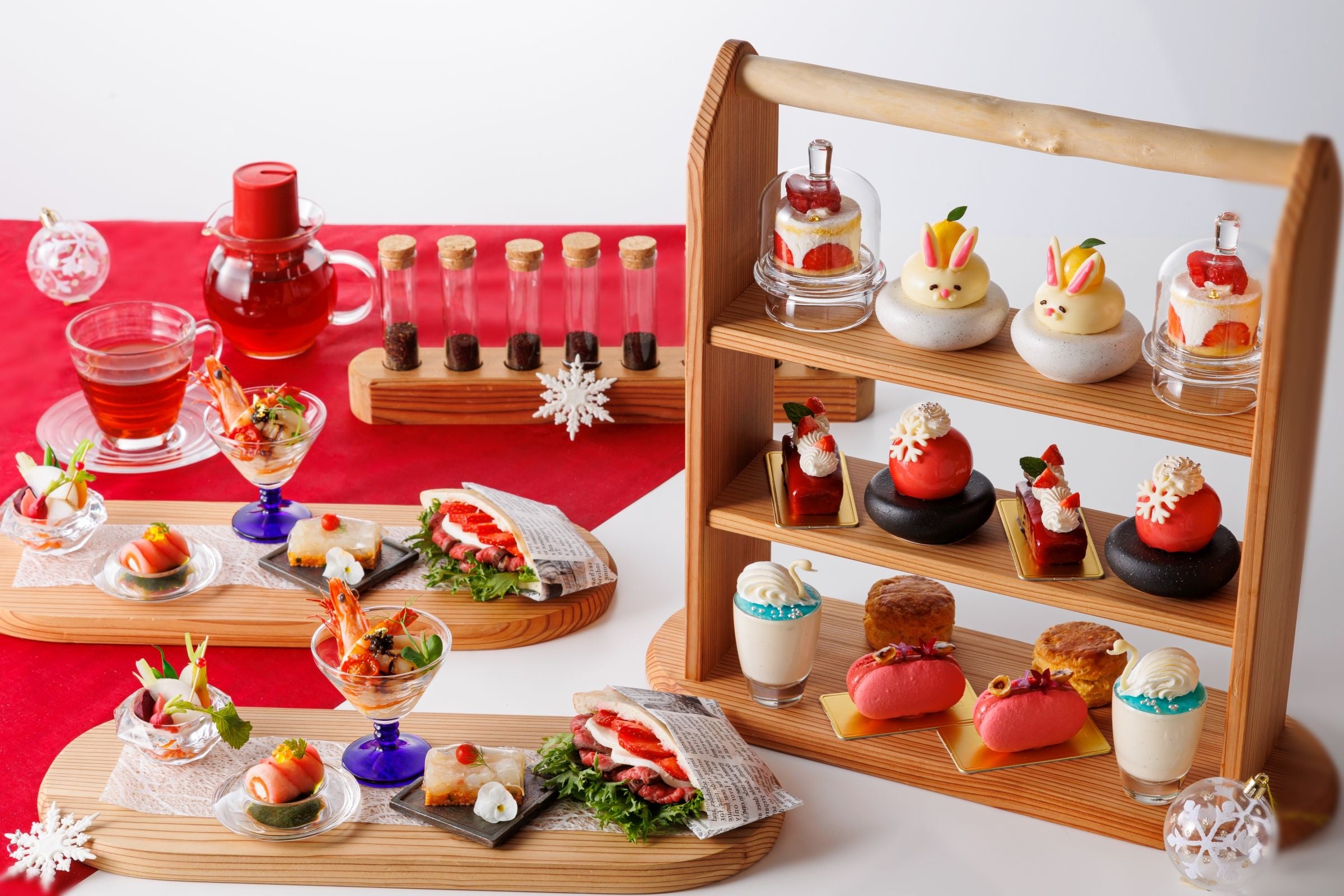 新春にふさわしく紅白に彩られたスイーツとセイボリーを、吉野杉のオリジナルスタンドでゆっくりとお楽しみください。