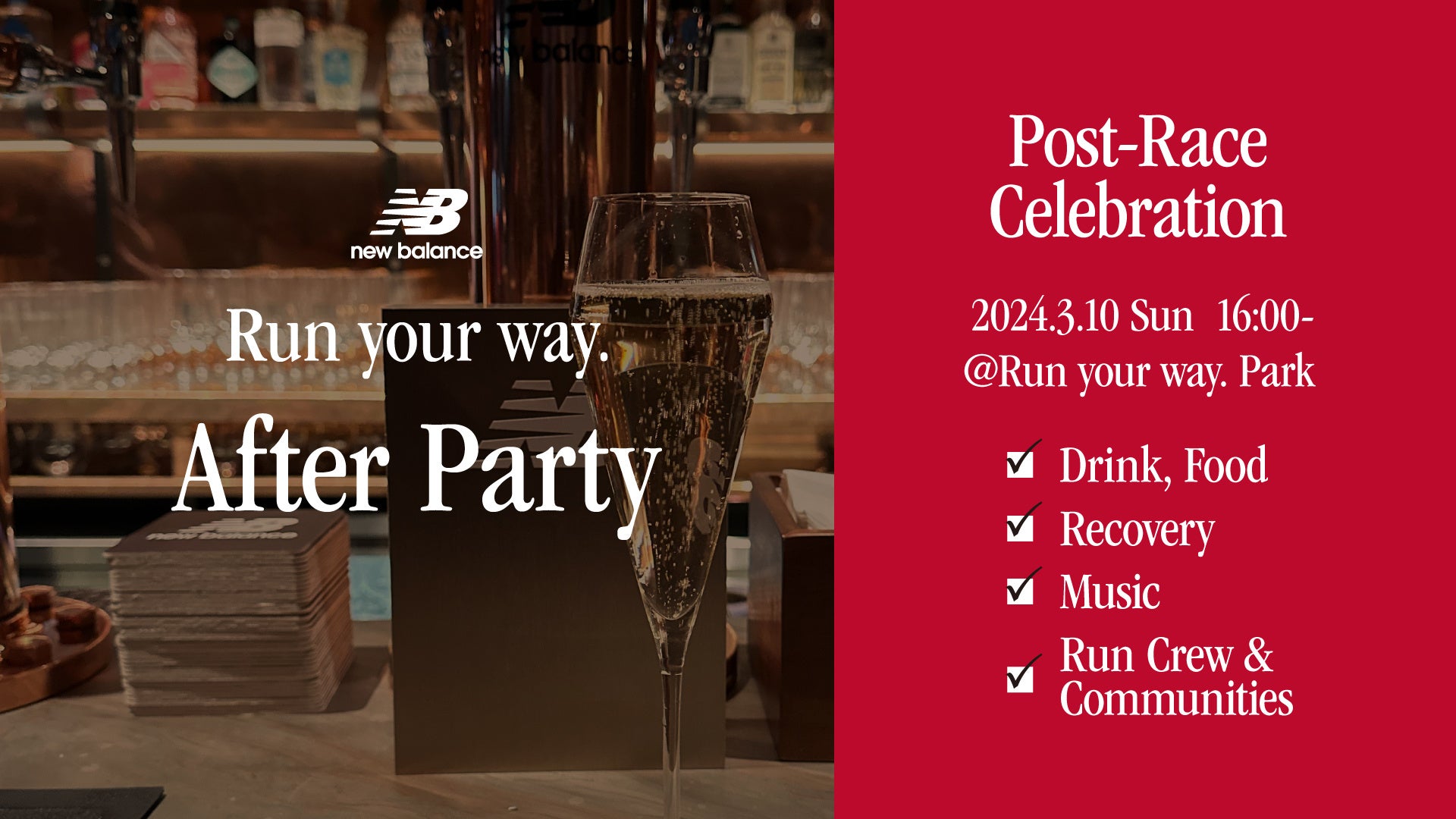 大会当日、レースを楽しんだ後はニューバランスが「After Party」をオーガナイズ。音楽やドリンクはもちろん、リカバリーフードやリカバリーマッサージなど、レース後のランナーのためのパーティをお届けします。同じレースを走ったランナー同士、その体験や思い出を分かち合うひとときをお楽しみください。