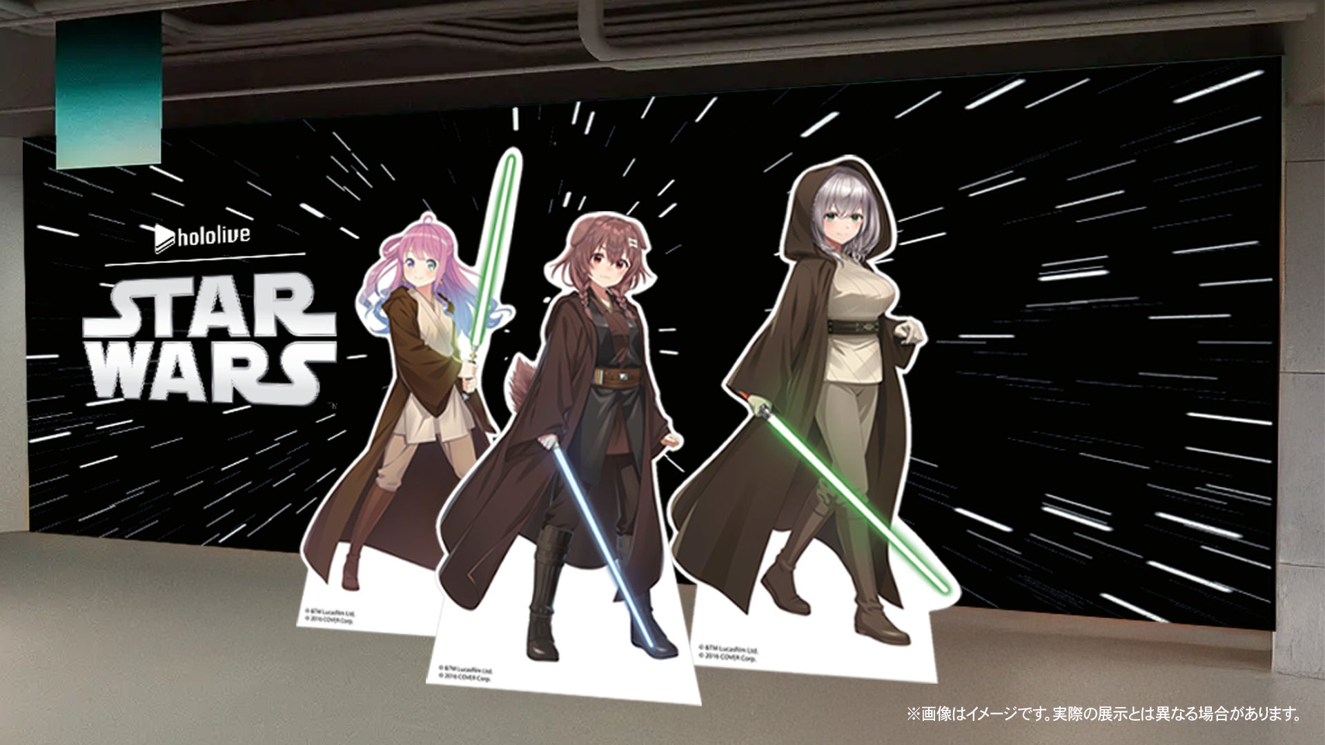「スター・ウォーズ」の世界観を体験できることはもちろん、今回の応援プロジェクトのために制作された、ホロライブスターウォーズ部3名の特別衣装の等身大パネルを展示!