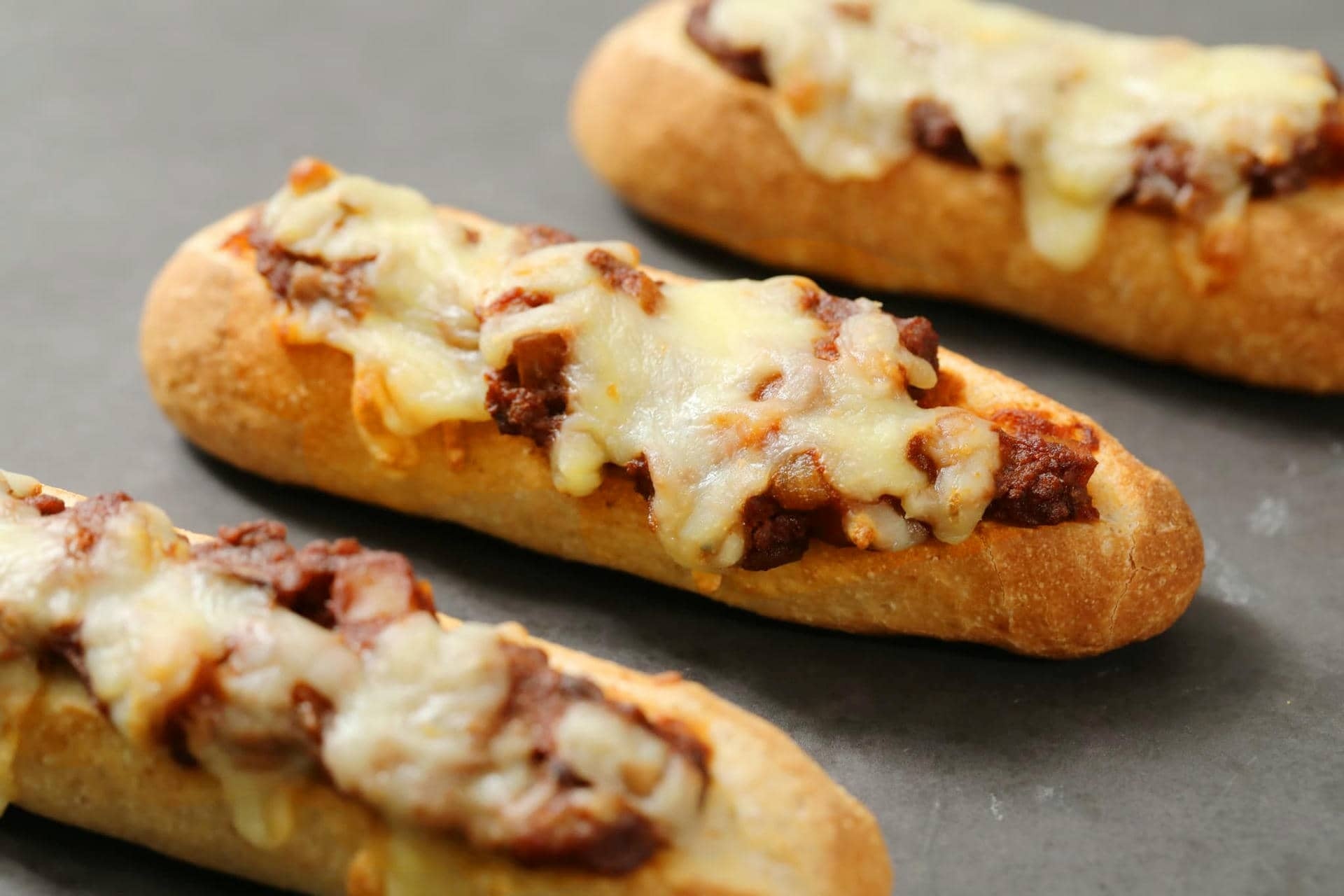 バゲットにビーフシチューとチーズをトッピングしてこんがりと焼き上げました。バゲット