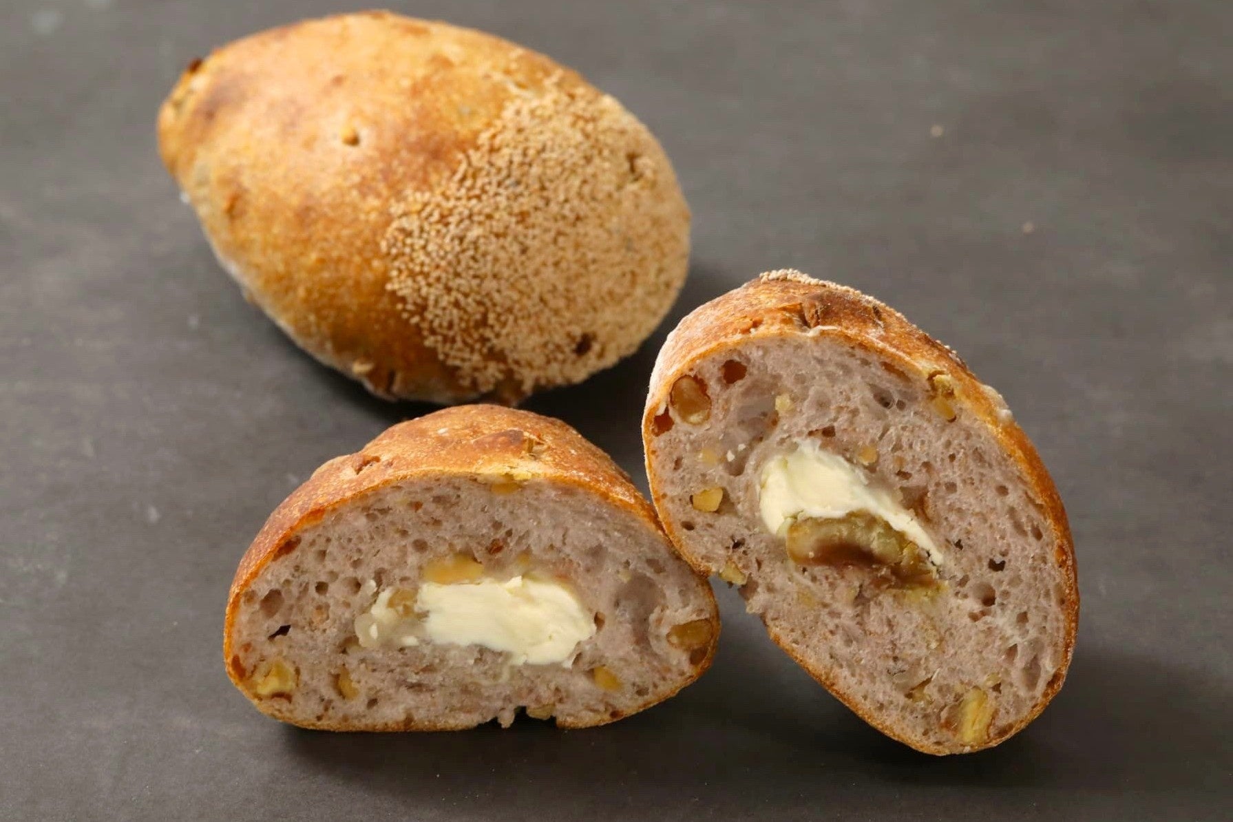 りこみ、クリームチーズを包んで焼き上げました。ライ麦の素朴な風味が香る生地から、甘