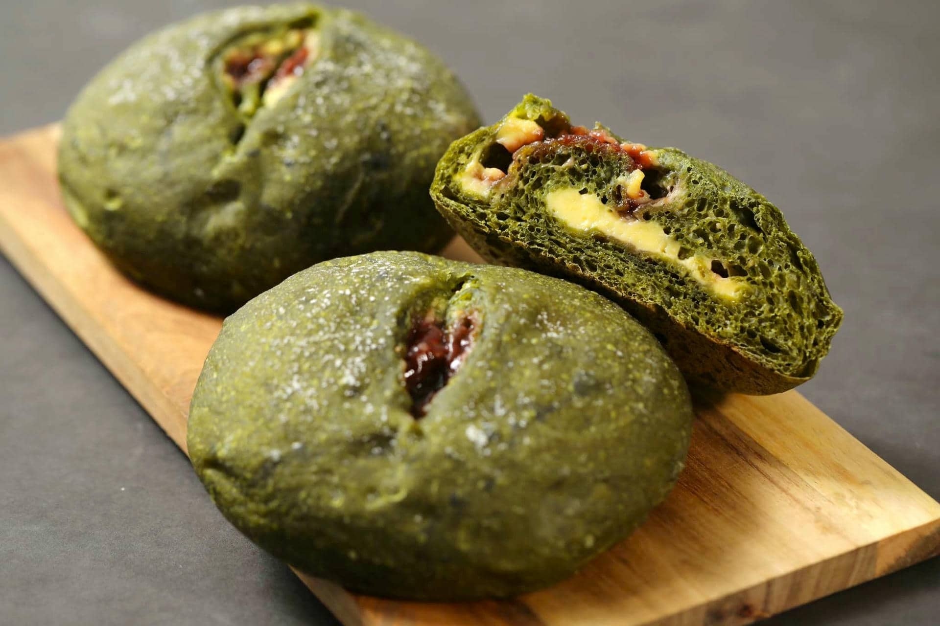 で、フランボワーズジャムとカスタードを包んで焼き上げました。渋みのある抹茶の風味