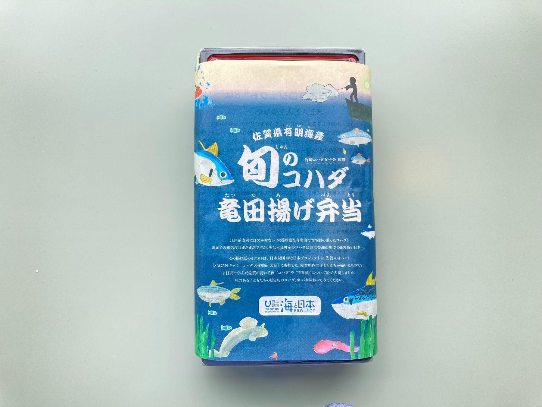 このお弁当の掛け紙には、2022年9月初旬の日本財団 海と日本プロジェクトin佐賀イベント【SAGANキッズ コハダ大作戦in太良】に参加した県内の小学生が描いた絵を使用。子どもたちはこの体験学習イベントを通して、コハダの生態や近年漁獲高が減少傾向にあるという問題を知り、これからも地元の誇りであるコハダや有明海を守り引き継ぎたいという想いを絵で表現しました。