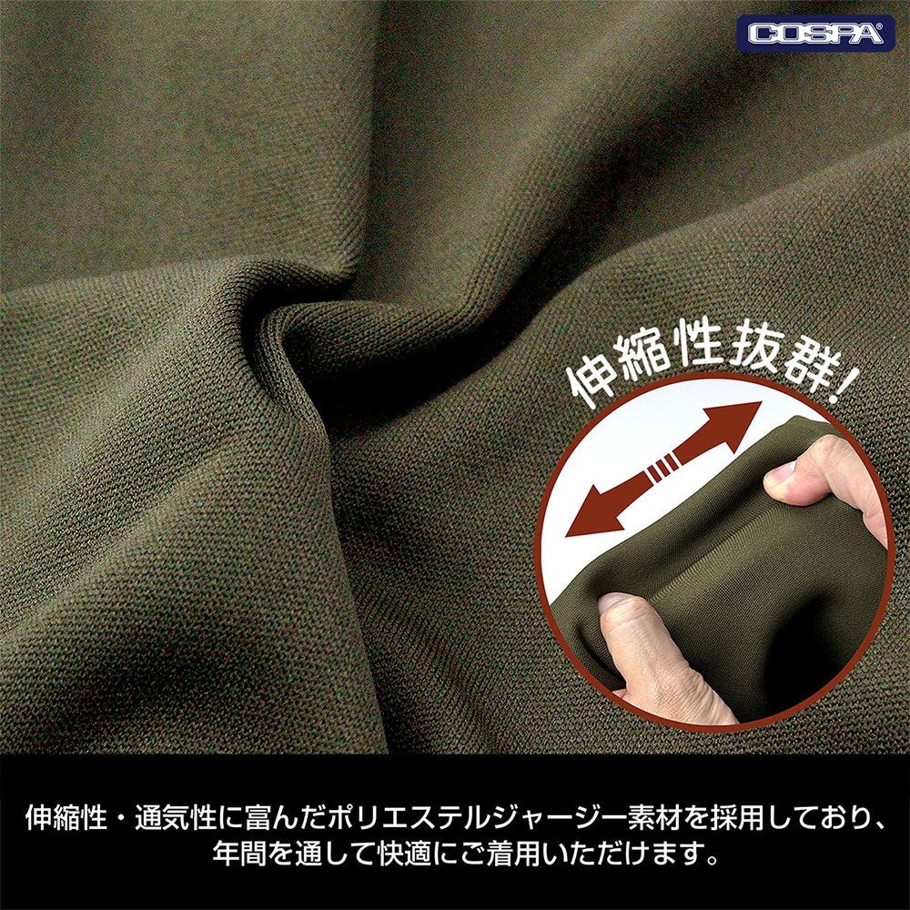 ・伸縮性、通気性に富んだポリエステルジャージー素材を採用しており、年間を通して快適にご着用いただけます。
