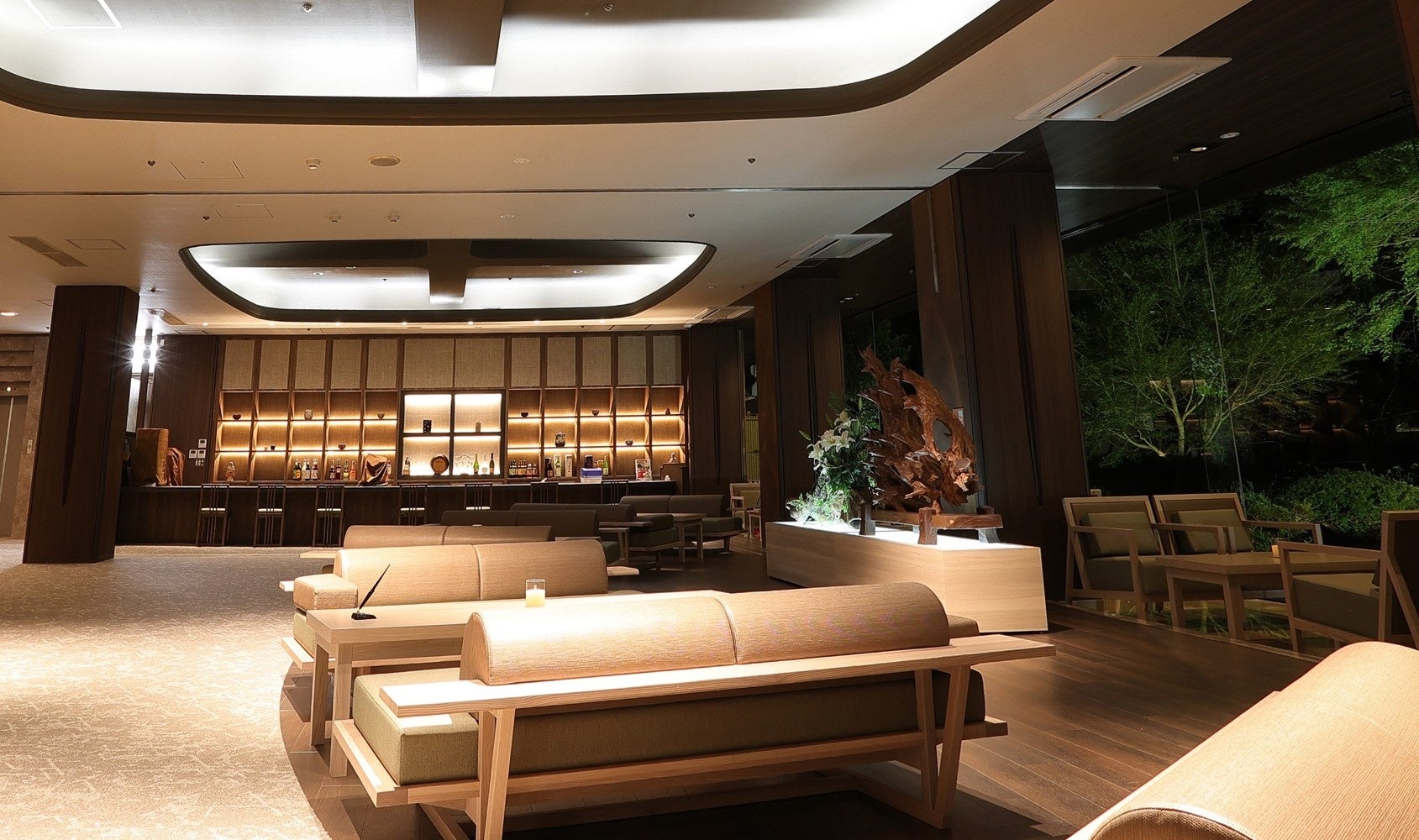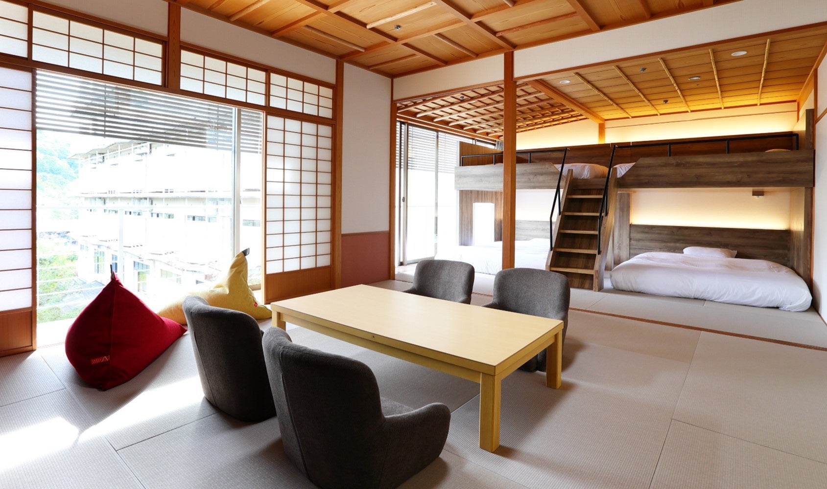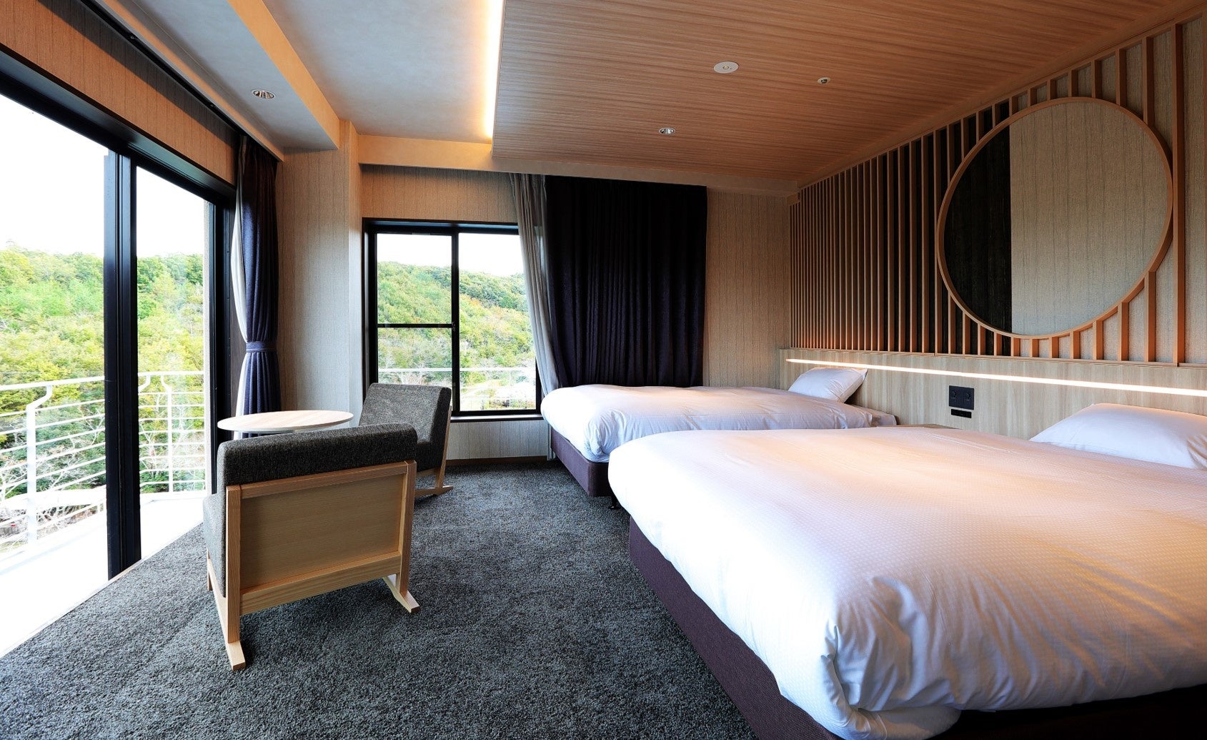 改修工事は、「四季の変化を感じられる、五感に響く上質な大人の空間」をコンセプトとして実施しました。客室のデザインは、多様化するお客様のご要望や期待にお応えし、海外のお客様にも日本の伝統を感じていただけるよう、和室・特別室など今までの6つの客室タイプから、全客室にベッドを設置し、1室だけの特別な客室として、バルコニーから四季折々の自然が望め、半露天風呂付きの83㎡のロイヤルスイートルーム、小さなお子様がいらっしゃるご家族や三世代旅行におすすめの、旅館では珍しい2段ベッドを設置したファミリースイートルーム、グループ旅行に便利なベッドを4台設置した和モダンフォースルーム、露天風呂付和モダンツインルームなど、全10タイプ57室の客室をご用意しました。温泉大浴場には、寝ころびながら温泉をお楽しみいただける「寝湯」、食事処にはロイヤルスイートルームにご宿泊のお客様専用の個室を新設し、ロビーラウンジは新しいインテリアを採用してデザインを一新し、夕方以降はライトアップされた庭園をお楽しみいただけるくつろぎのスペースとなりました。