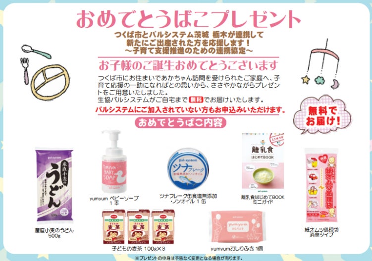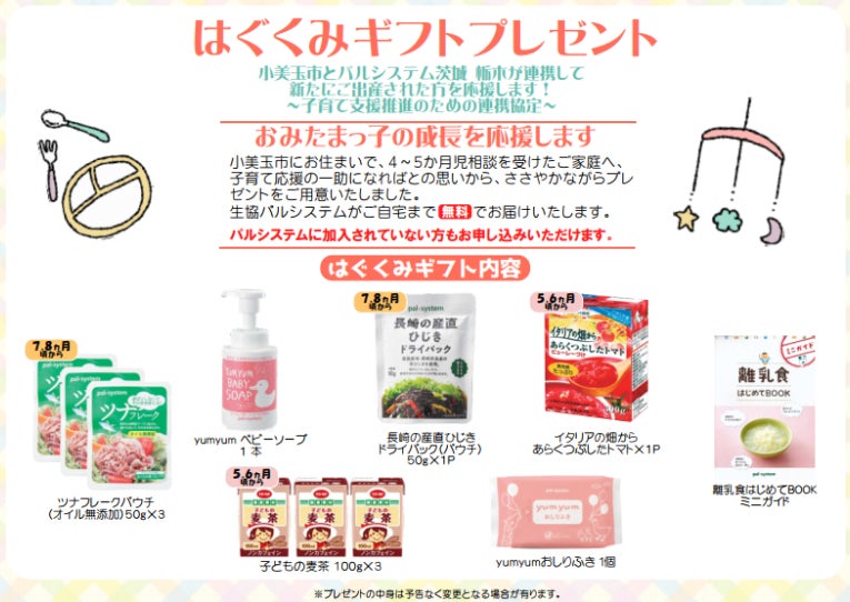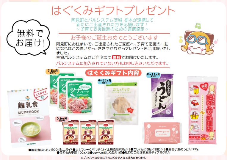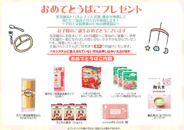 協定書に基づき各行政は、保健師や助産師による赤ちゃん訪問や乳児健診時に、出生祝いとして育児用品を詰め合わせた「おめでとうばこ」や「はぐくみギフト」の案内カードを配付します。出生祝いは、パルシステムオリジナル商品の食材やおしりふき、離乳食づくりに役立つミニガイドなどを詰め合わせます。